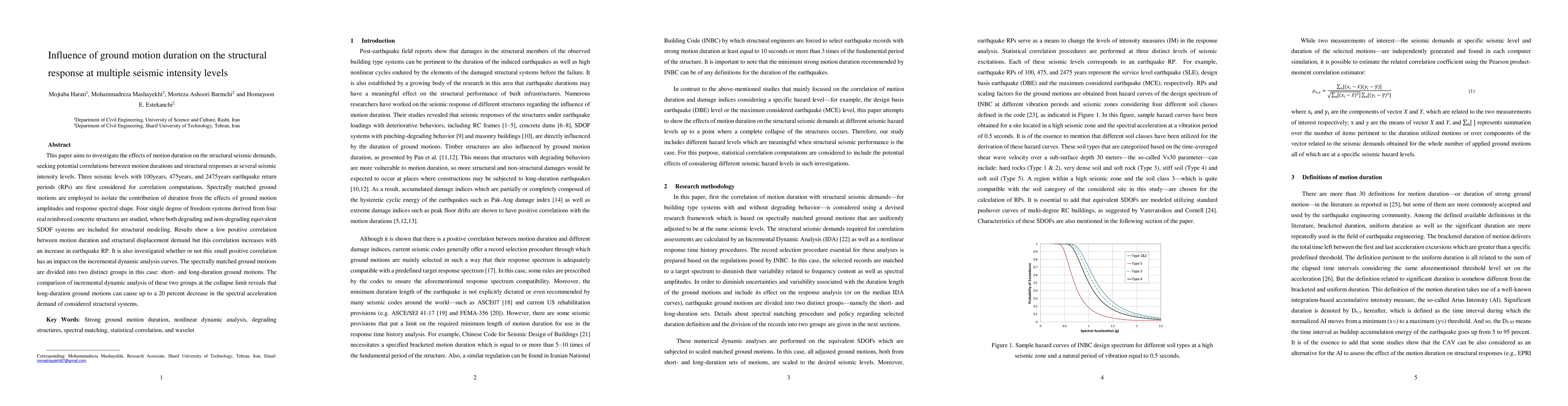 This paper investigates the impact of ground motion duration on seismic demands of structures at various intensity levels, finding a low positive correlation between duration and displacement demand that strengthens with higher earthquake return periods. Long-duration ground motions show a 20 percent decrease in spectral acceleration demand compared to short-duration motions.