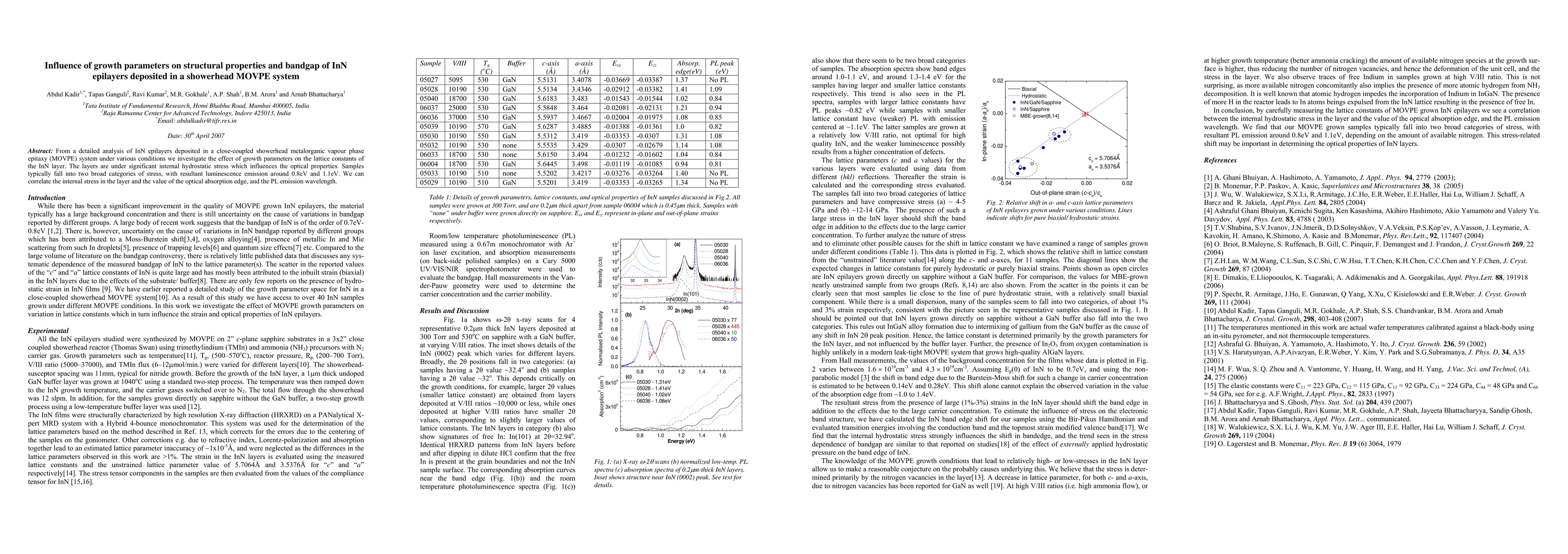 From a detailed analysis of InN epilayers deposited in a close-coupled showerhead metalorganic vapour phase epitaxy (MOVPE) system under various conditions we investigate the effect of growth parameters on the lattice constants of the InN layer. The layers are under significant internal hydrostatic stress which influences the optical properties. Samples typically fall into two broad categories of stress, with resultant luminescence emission around 0.8eV and 1.1eV. We can correlate the internal stress in the layer and the value of the optical absorption edge, and the PL emission wavelength.