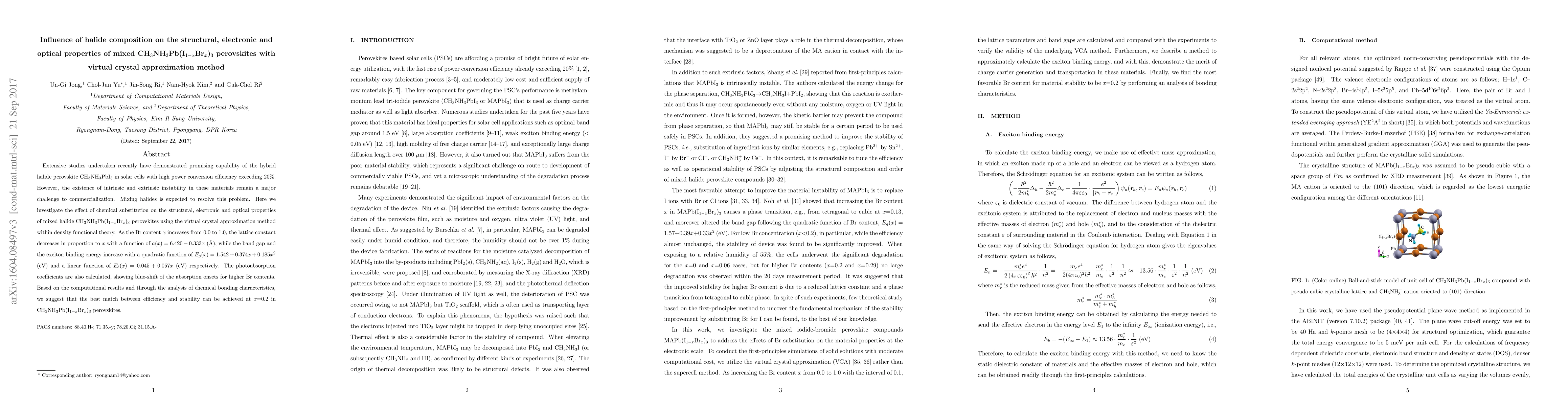 This study uses the virtual crystal approximation method within density functional theory to analyze the structural, electronic, and optical properties of mixed bromide-iodide perovskites. The research shows that mixed halide perovskites are effective for generating and conducting charge carriers, with improved stability and performance at a bromide content of 0.2.