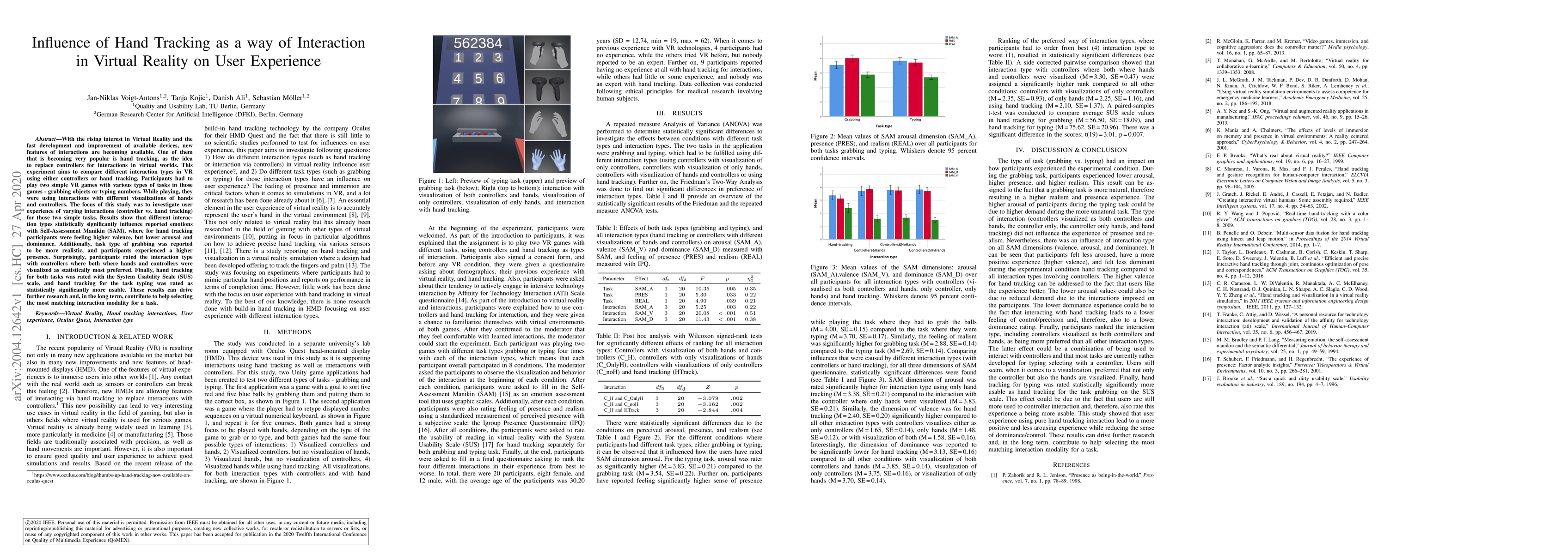 With the rising interest in Virtual Reality and the fast development and improvement of available devices, new features of interactions are becoming available. One of them that is becoming very popular is hand tracking, as the idea to replace controllers for interactions in virtual worlds. This experiment aims to compare different interaction types in VR using either controllers or hand tracking. Participants had to play two simple VR games with various types of tasks in those games - grabbing objects or typing numbers. While playing, they were using interactions with different visualizations of hands and controllers. The focus of this study was to investigate user experience of varying interactions (controller vs. hand tracking) for those two simple tasks. Results show that different interaction types statistically significantly influence reported emotions with Self-Assessment Manikin (SAM), where for hand tracking participants were feeling higher valence, but lower arousal and dominance. Additionally, task type of grabbing was reported to be more realistic, and participants experienced a higher presence. Surprisingly, participants rated the interaction type with controllers where both where hands and controllers were visualized as statistically most preferred. Finally, hand tracking for both tasks was rated with the System Usability Scale (SUS) scale, and hand tracking for the task typing was rated as statistically significantly more usable. These results can drive further research and, in the long term, contribute to help selecting the most matching interaction modality for a task.