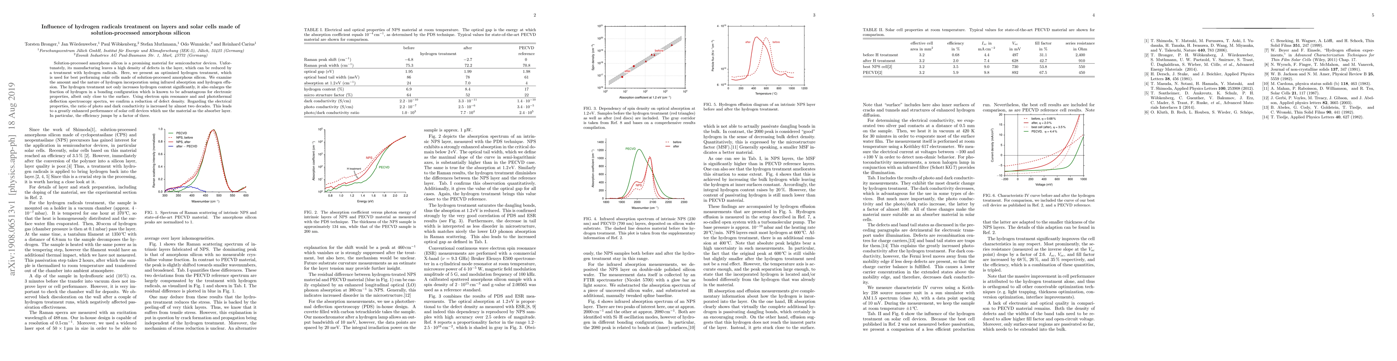 This study optimizes hydrogen radical treatment to reduce defects in solution-processed amorphous silicon layers, significantly enhancing electronic properties and solar cell efficiency by a factor of three. The treatment increases hydrogen bonding and improves conductivity ratios, confirmed through various spectroscopic analyses.
