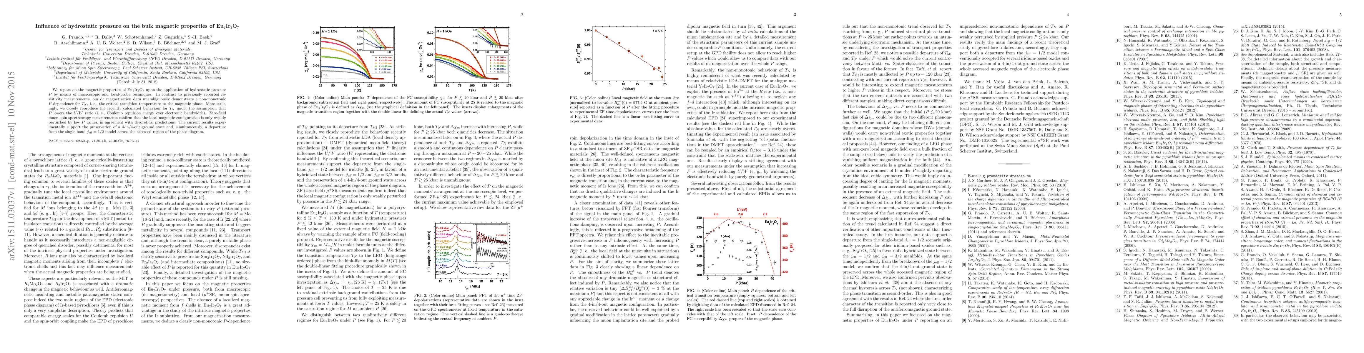 This research investigates the effects of hydrostatic pressure on the magnetic properties of Eu2Ir2O7. It finds a non-monotonic pressure dependence of the Neel temperature T_N, supporting theoretical predictions. Local-probe muon-spin spectroscopy reveals minimal perturbation of the magnetic configuration under low pressure, suggesting preservation of a 4-in/4-out ground state and deviation from a single-band j_eff=1/2 model.