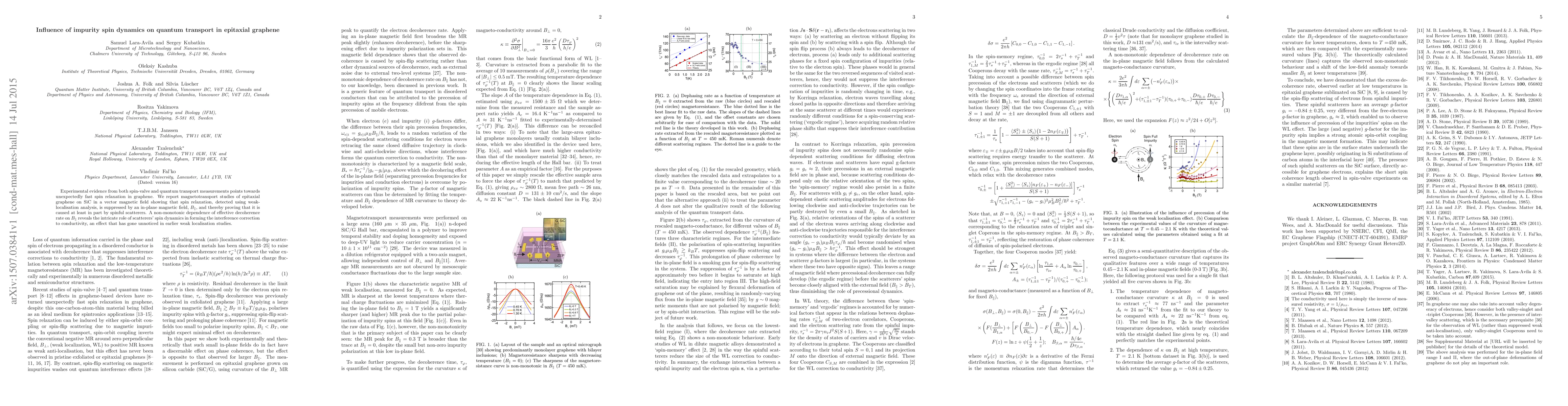 This study reveals that impurity spin dynamics significantly influence quantum transport in epitaxial graphene, as evidenced by suppressed spin relaxation under an in-plane magnetic field, indicating the presence of spinful scatterers. The non-monotonic dependence of the effective decoherence rate on this magnetic field highlights the complex role of scatterers' spin dynamics in shaping the interference correction to conductivity.