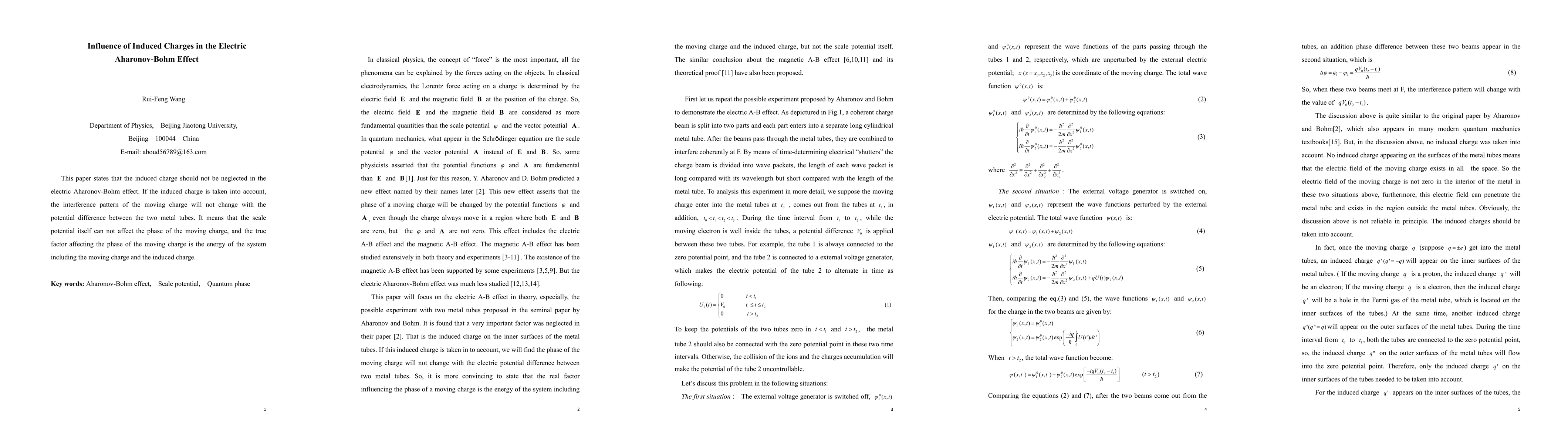 This paper states that the induced charge should not be neglected in the electric Aharonov-Bohm effect. If the induced charge is taken into account, the interference pattern of the moving charge will not change with the potential difference between the two metal tubes. It means that the scale potential itself can not affect the phase of the moving charge, and the true factor affecting the phase of the moving charge is the energy of the system including the moving charge and the induced charge.