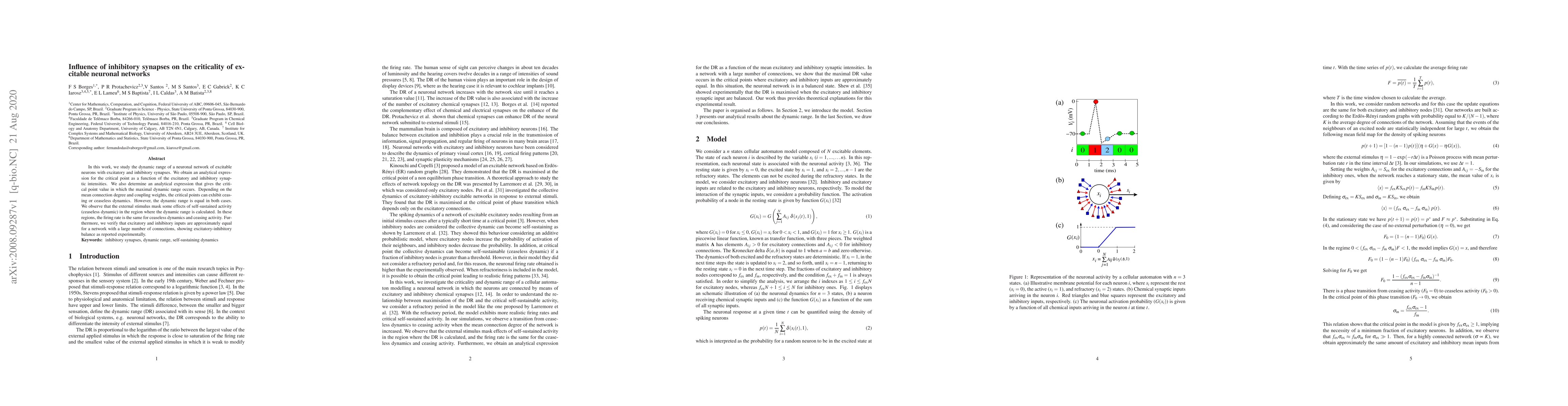 In this work, we study the dynamic range of a neuronal network of excitable neurons with excitatory and inhibitory synapses. We obtain an analytical expression for the critical point as a function of the excitatory and inhibitory synaptic intensities. We also determine an analytical expression that gives the critical point value in which the maximal dynamic range occurs. Depending on the mean connection degree and coupl\-ing weights, the critical points can exhibit ceasing or ceaseless dynamics. However, the dynamic range is equal in both cases. We observe that the external stimulus mask some effects of self-sustained activity (ceaseless dynamic) in the region where the dynamic range is calculated. In these regions, the firing rate is the same for ceaseless dynamics and ceasing activity. Furthermore, we verify that excitatory and inhibitory inputs are approximately equal for a network with a large number of connections, showing excitatory-inhibitory balance as reported experimentally.
