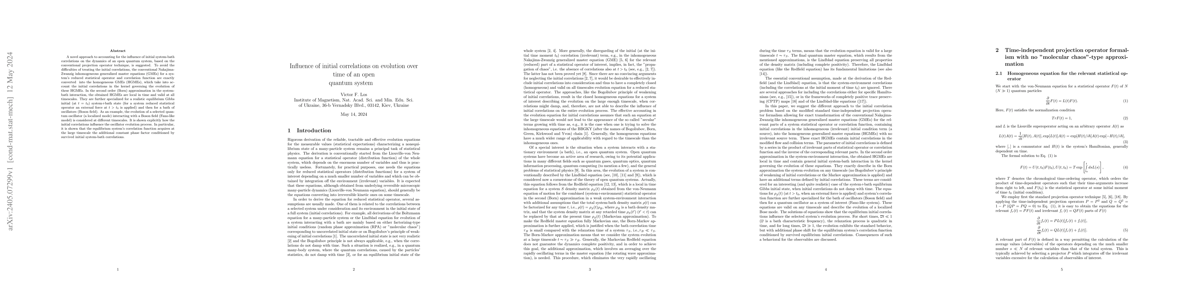The paper proposes a method to account for initial system-bath correlations in the dynamics of open quantum systems using a modified Nakajima-Zwanzig equation. The resulting homogeneous generalized master equations, valid at all timescales, demonstrate how initial correlations affect the evolution of a quantum oscillator in a Boson field, including an additional phase factor in its correlation function at large timescales.