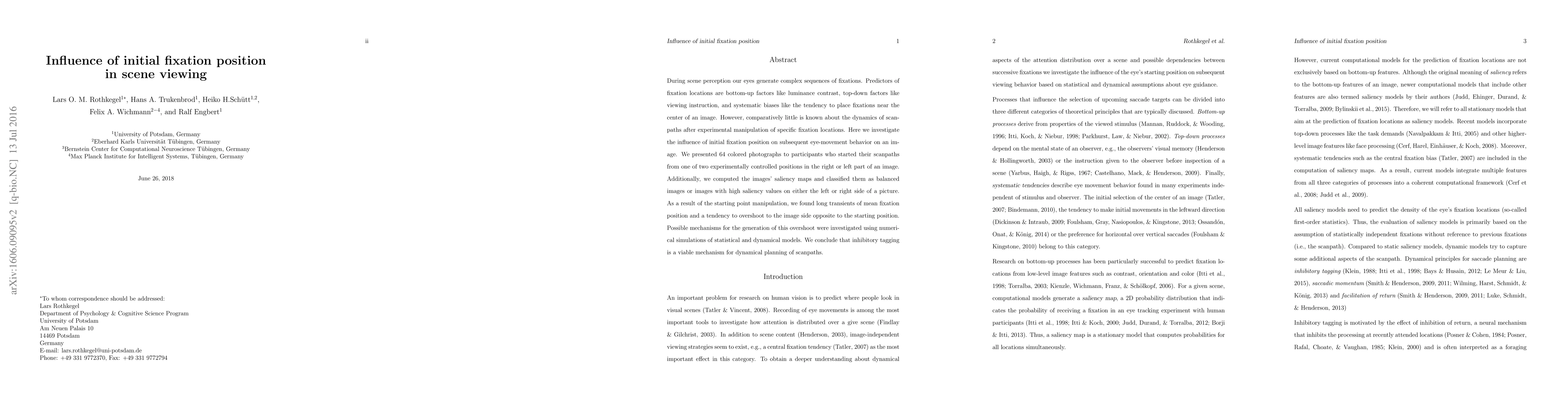 This study investigates how initial fixation position influences subsequent eye movements during scene viewing, finding that starting from one side leads to a tendency to overshoot to the opposite side. The research suggests that inhibitory tagging may dynamically guide scanpath planning.