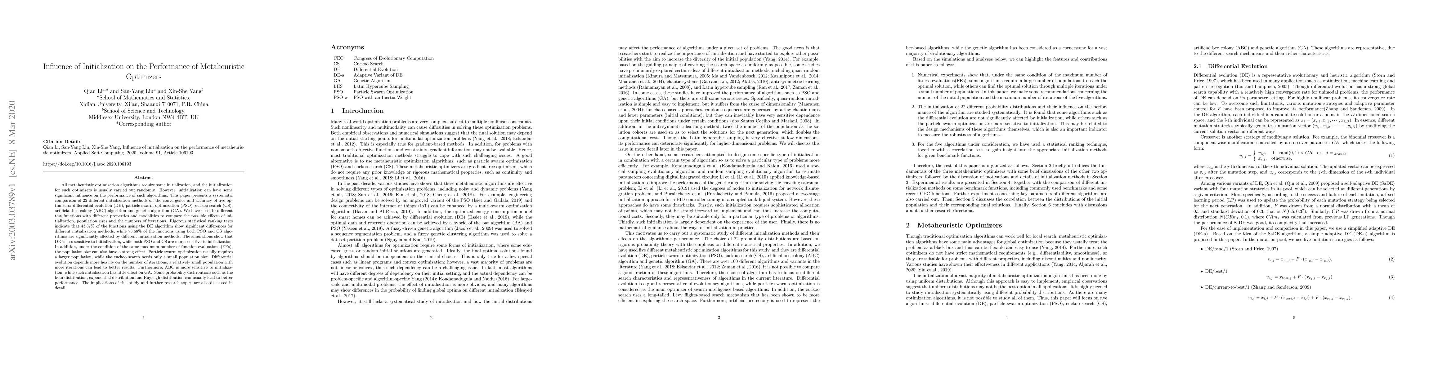 This study compares 22 initialization methods for five metaheuristic optimizers on 19 test functions, finding that DE is less sensitive to initialization, while PSO and CS are more sensitive; population size also affects performance in some cases.