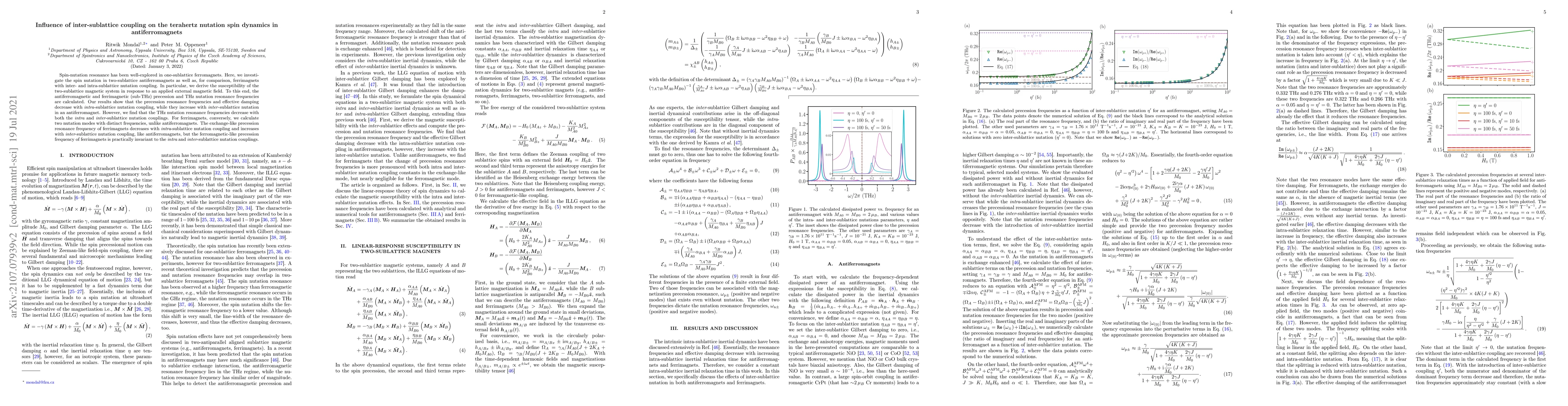 Spin nutation resonance has been well-explored in one-sublattice ferromagnets. Here, we investigate the spin nutation in two-sublattice antiferromagnets as well as, for comparison, ferrimagnets with inter-and intra-sublattice nutation coupling. In particular, we derive the susceptibility of the two-sublattice magnetic system in response to an applied external magnetic field. To this end, the antiferromagnetic and ferrimagnetic (sub-THz) precession and THz nutation resonance frequencies are calculated. Our results show that the precession resonance frequencies and effective damping decrease with intra-sublattice nutation coupling, while they increase with inter -sublattice nutation in an antiferromagnet. However, we find that the THz nutation resonance frequencies decrease with both the intra-and inter-sublattice nutation couplings. For ferrimagnets, conversely, we calculate two nutation modes with distinct frequencies, unlike antiferromagnets. The exchange-like precession resonance frequency of ferrimagnets decreases with intra-sublattice nutation coupling and increases with inter-sublattice nutation coupling, like antiferromagnets, but the ferromagnetic-like precession frequency of ferrimagnets is practically invariant to the intra and inter-sublattice nutation couplings.