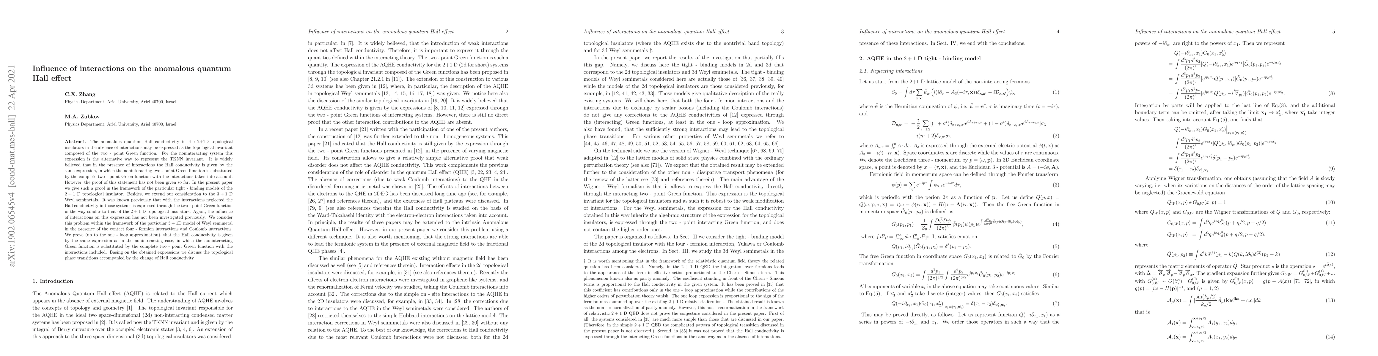 The anomalous quantum Hall conductivity in the 2+1D topological insulators in the absence of interactions may be expressed as the topological invariant composed of the two - point Green function. For the noninteracting system this expression is the alternative way to represent the TKNN invariant. It is widely believed that in the presence of interactions the Hall conductivity is given by the same expression, in which the noninteracting two - point Green function is substituted by the complete two - point Green function with the interactions taken into account. However, the proof of this statement has not been given so far. In the present paper we give such a proof in the framework of the particular tight - binding models of the $2+1$ D topological insulator. Besides, we extend our consideration to the $3+1$ D Weyl semimetals. It was known previously that with the interactions neglected the Hall conductivity in those systems is expressed through the two - point Green function in the way similar to that of the $2+1$ D topological insulators. Again, the influence of interactions on this expression has not been investigated previously. We consider this problem within the framework of the particular $3+1$D model of Weyl semimetal in the presence of the contact four - fermion interactions and Coulomb interactions. We prove (up to the one - loop approximation), that the Hall conductivity is given by the same expression as in the noninteracting case, in which the noninteracting Green function is substituted by the complete two - point Green function with the interactions included. Basing on the obtained expressions we discuss the topological phase transitions accompanied by the change of Hall conductivity.