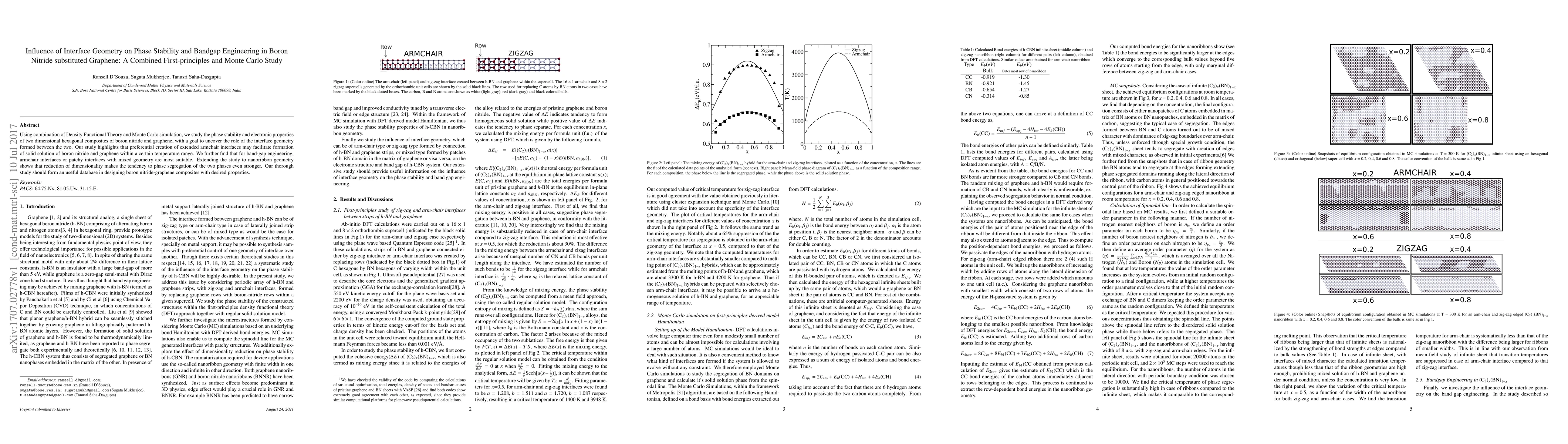 This study combines Density Functional Theory and Monte Carlo simulations to investigate the phase stability and electronic properties of boron nitride-graphene composites, finding that armchair interfaces promote solid solution formation and mixed geometry interfaces are optimal for bandgap engineering. The research also reveals that reduced dimensionality enhances phase segregation tendencies.
