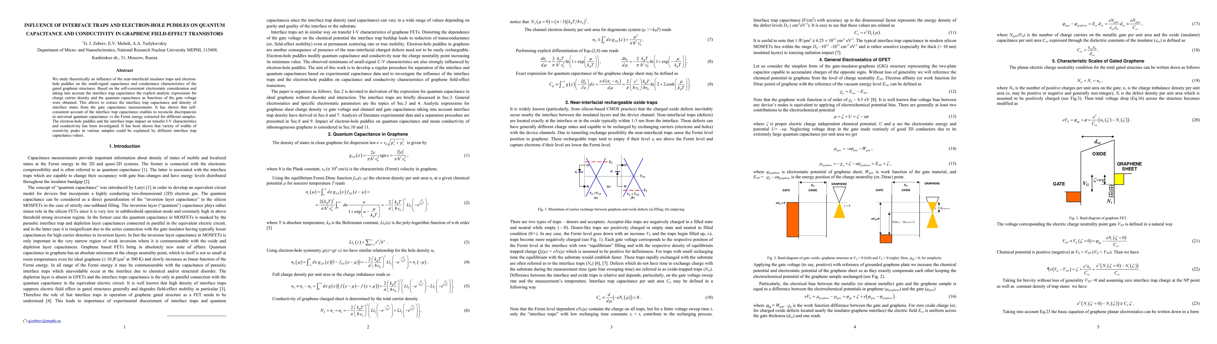 This paper theoretically investigates how near-interfacial insulator traps and electron-hole puddles affect the capacitance and conductivity in graphene field-effect transistors. It provides analytic expressions for quantum capacitance and charge carrier density, enabling extraction of interface trap capacitance and state density from gate measurements, thus reconciling discrepancies in quantum capacitance across different samples.