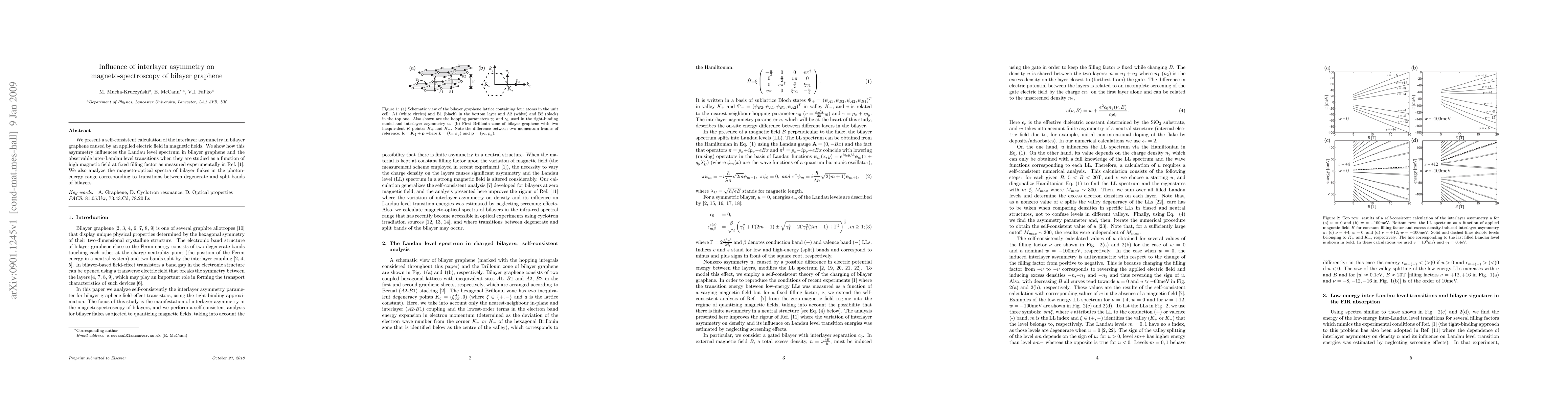 This study investigates the effect of interlayer asymmetry in bilayer graphene caused by an applied electric field, showing its impact on the Landau level spectrum and magneto-spectroscopy. It finds that asymmetry affects inter-Landau level transitions in magnetic fields, aligning with experimental observations.
