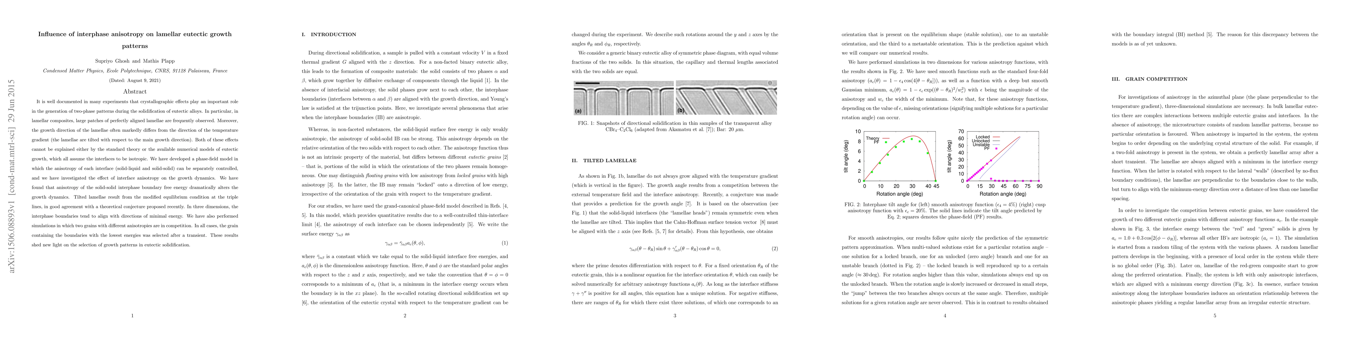This paper investigates how interphase anisotropy affects the growth patterns of lamellar eutectic alloys, finding that anisotropic solid-solid interphase boundaries significantly alter growth dynamics, leading to tilted lamellae. The study uses a phase-field model to demonstrate that interphase boundaries align with minimal energy directions, influencing the selection of competing grains.