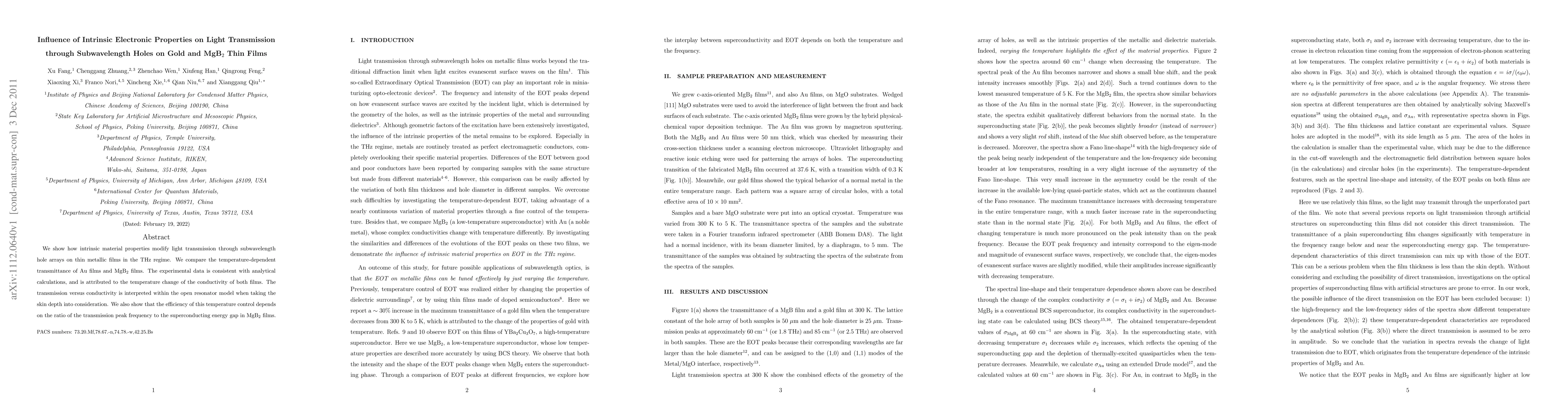 Researchers study how temperature affects light transmission through tiny holes in gold and magnesium diboride thin films, finding that conductivity plays a key role.