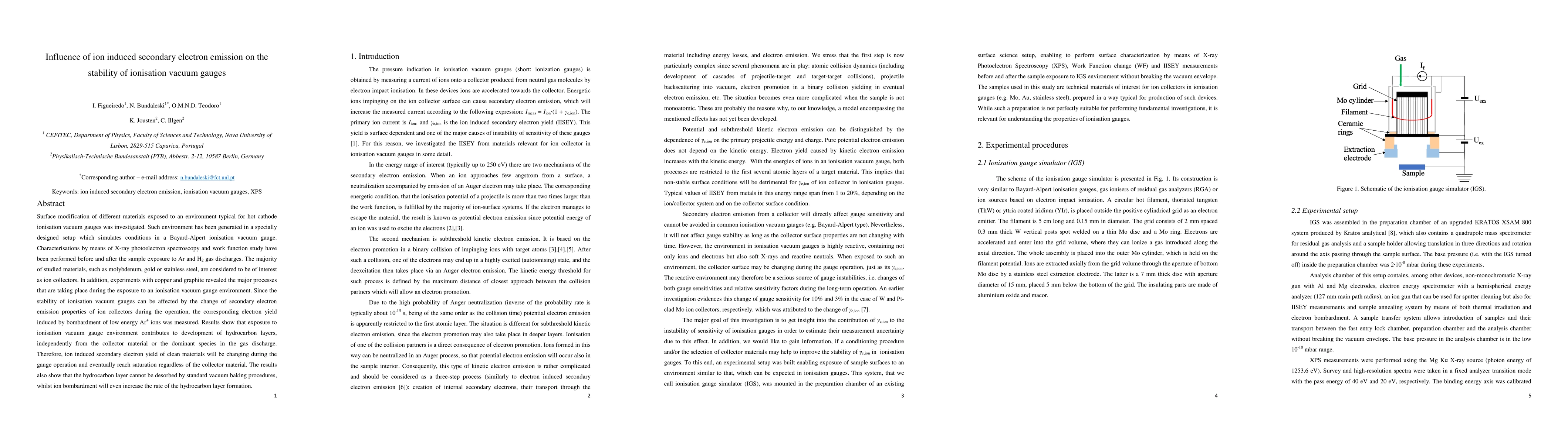 This study investigates the impact of ion-induced secondary electron emission on the stability of ionisation vacuum gauges by examining surface modifications in various materials exposed to a simulated gauge environment. Results indicate that exposure leads to hydrocarbon layer formation, altering secondary electron yield and affecting gauge stability, with ion bombardment exacerbating the issue.