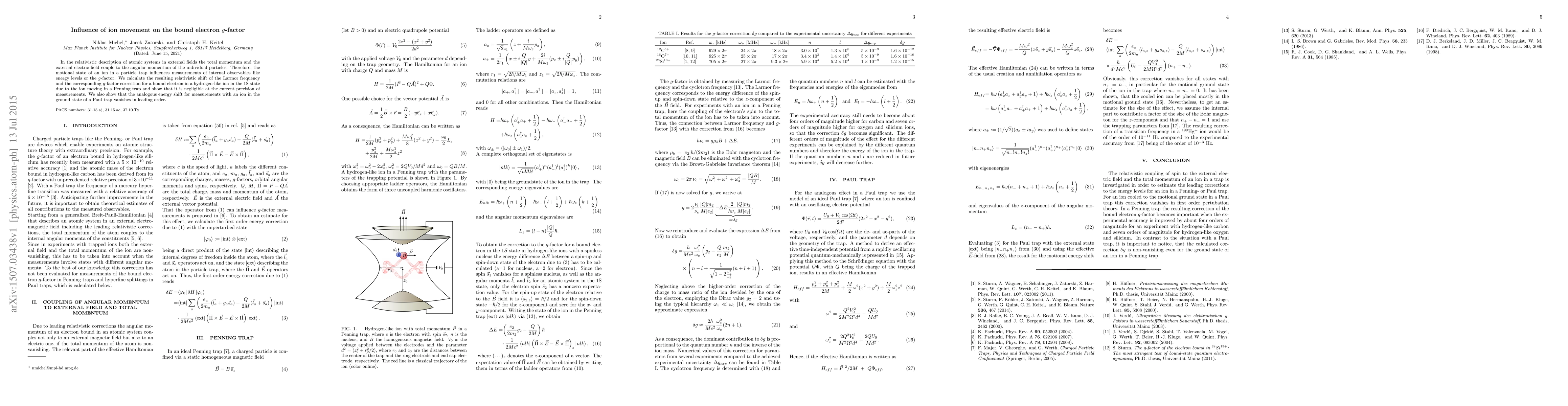 In the relativistic description of atomic systems in external fields the total momentum and the external electric field couple to the angular momentum of the individual particles. Therefore, the motional state of an ion in a particle trap influences measurements of internal observables like energy levels or the g-factor. We calculate the resulting relativistic shift of the Larmor frequency and the corresponding g-factor correction for a bound electron in a hydrogen-like ion in the 1S state due to the ion moving in a Penning trap and show that it is negligible at the current precision of measurements. We also show that the analogous energy shift for measurements with an ion in the ground state of a Paul trap vanishes in leading order.