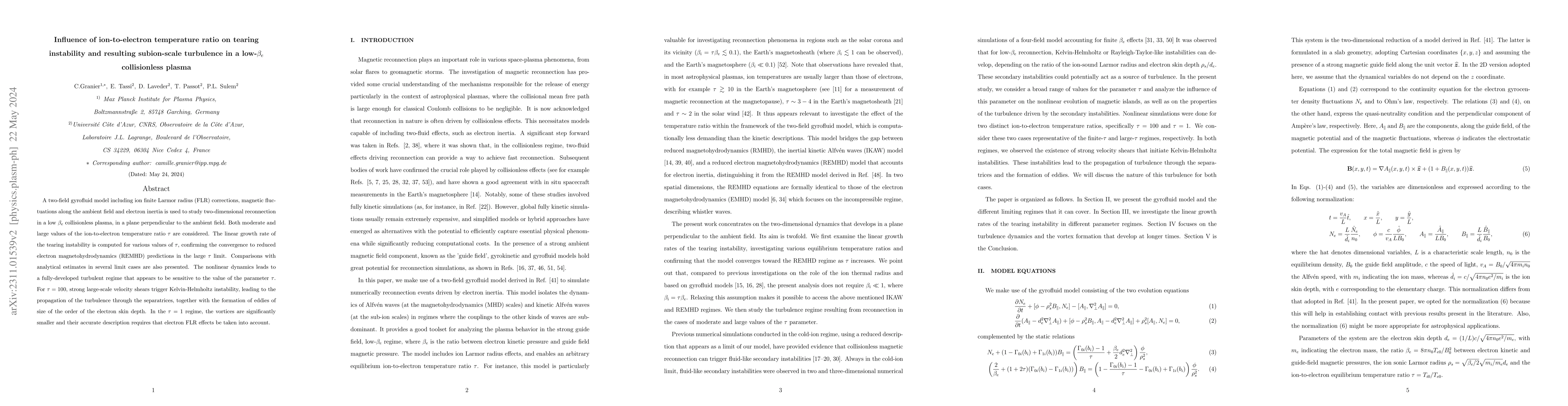 A two-field gyrofluid model including ion finite Larmor radius (FLR) corrections, magnetic fluctuations along the ambient field and electron inertia is used to study two-dimensional reconnection in a low $\beta_e$ collisionless plasma, in a plane perpendicular to the ambient field. Both moderate and large values of the ion-to-electron temperature ratio $\tau$ are considered. The linear growth rate of the tearing instability is computed for various values of $\tau$, confirming the convergence to reduced electron magnetodynamics (REMHD) predictions in the large $\tau$ limit. Comparisons with analytical estimates in several limit cases are also presented. The nonlinear dynamics leads to a fully-developed turbulent regime that appears to be sensitive to the value of the parameter $\tau$. For $\tau = 100$, strong large-scale velocity shears trigger Kelvin-Helmholtz instability, leading to the propagation of the turbulence through the separatrices, together with the formation of eddies of size of the order of the electron skin depth. In the $\tau = 1$ regime, the vortices are significantly smaller and their accurate description requires that electron FLR effects be taken into account.