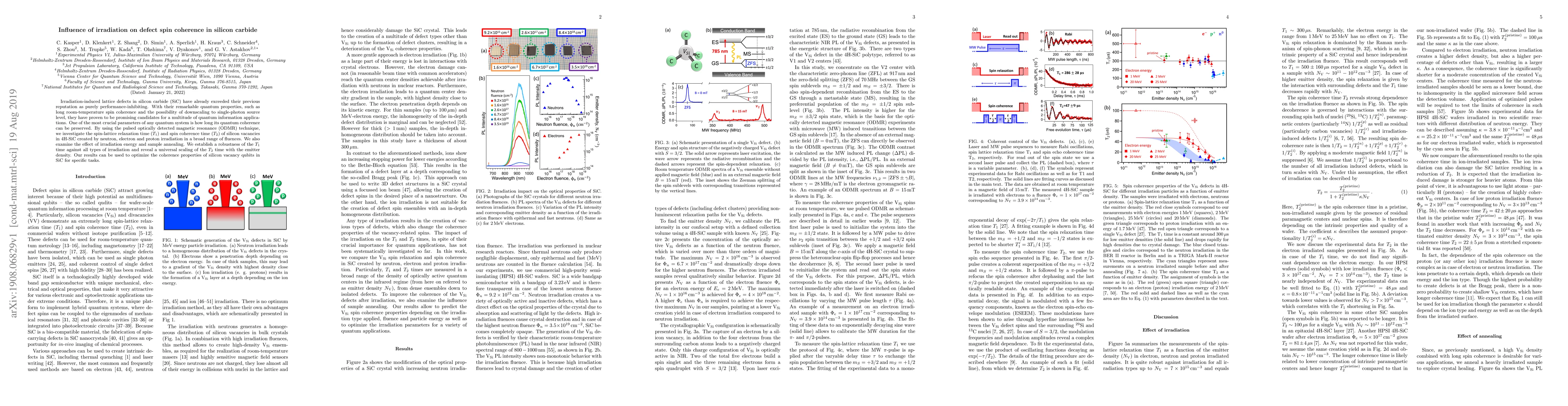 This study investigates the impact of various irradiation types on the spin coherence of silicon carbide defects, using pulsed optically detected magnetic resonance. It finds that while $T_1$ time remains robust, $T_2$ time scales universally with emitter density, providing insights for optimizing silicon vacancy qubits in SiC for quantum information applications.