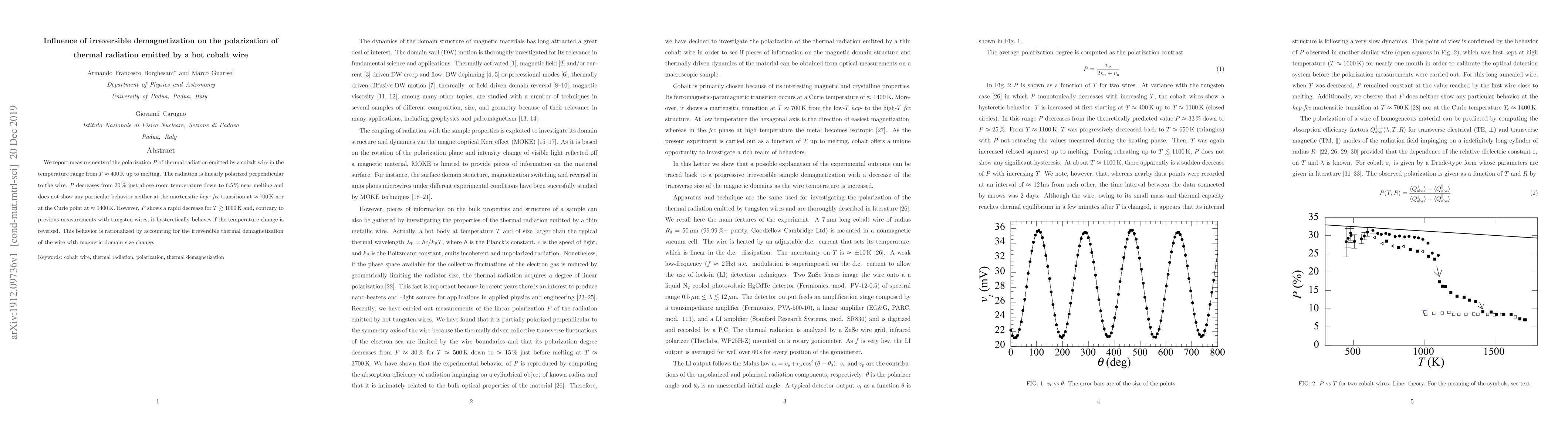 This research investigates the polarization ((P)) of thermal radiation from a heated cobalt wire, observing a decrease from 30% near room temperature to 6.5% near melting. Unlike tungsten wires, cobalt wires show hysteretic behavior above 1000K due to irreversible thermal demagnetization, involving magnetic domain size changes.