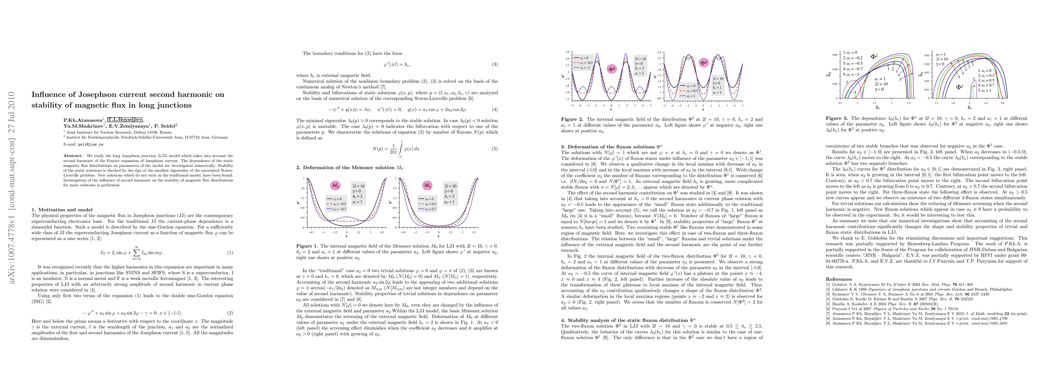 We study the long Josephson junction (LJJ) model which takes into account the second harmonic of the Fourier expansion of Josephson current. The dependence of the static magnetic flux distributions on parameters of the model are investigated numerically. Stability of the static solutions is checked by the sign of the smallest eigenvalue of the associated Sturm-Liouville problem. New solutions which do not exist in the traditional model, have been found. Investigation of the influence of second harmonic on the stability of magnetic flux distributions for main solutions is performed.