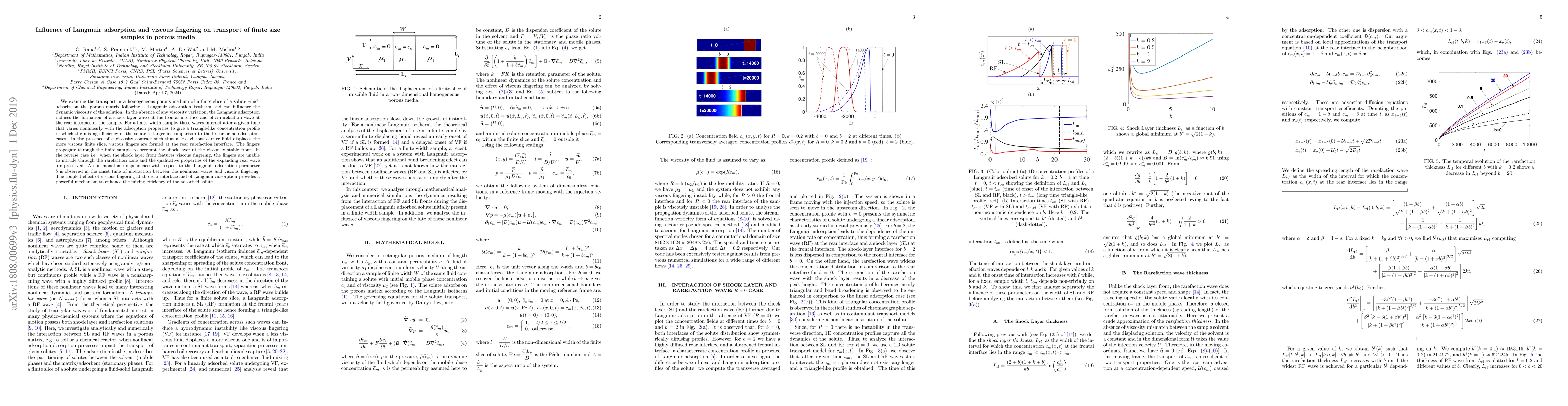 This paper investigates the transport dynamics of a finite solute sample in a porous medium, focusing on the effects of Langmuir adsorption and viscous fingering. The study reveals that Langmuir adsorption can lead to shock and rarefaction waves, enhancing mixing efficiency, while viscous fingering alters the transport behavior depending on the viscosity contrast between the displacing fluid and the sample.