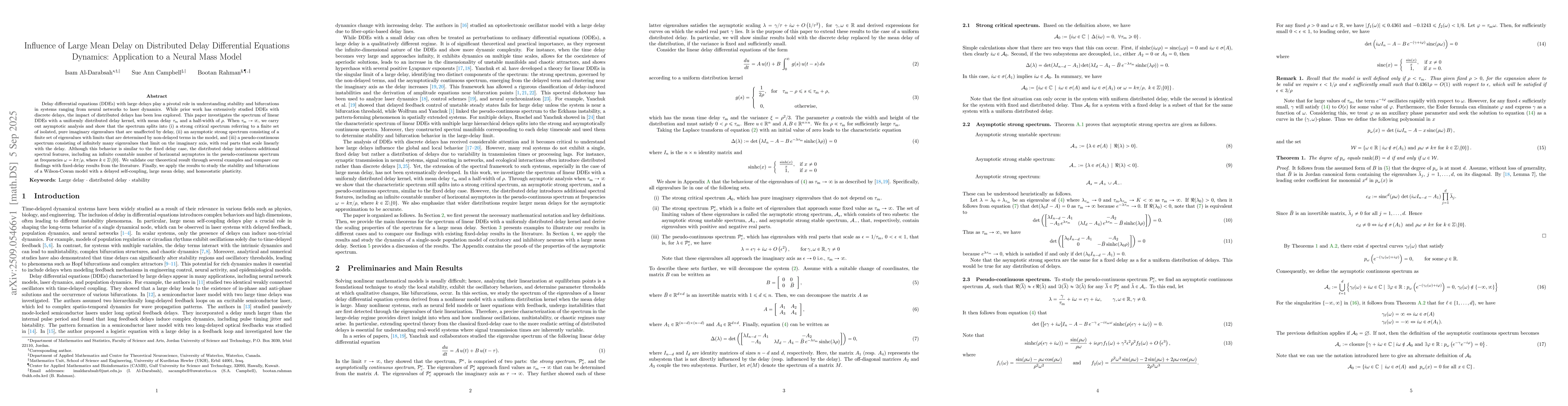 Delay differential equations (DDEs) with large delays play a pivotal role in understanding stability and bifurcations in systems ranging from neural networks to laser dynamics. While prior work has extensively studied DDEs with discrete delays, the impact of distributed delays has been less explored. This paper investigates the spectrum of linear DDEs with a uniformly distributed delay kernel, with mean delay $\tau_m$ and a half-width of $\rho$. When $\tau_m\to\infty$, we carry out asymptotic analysis and show that the spectrum splits into (i) a strong critical spectrum referring to a finite set of isolated, pure imaginary eigenvalues that are unaffected by delay, (ii) an asymptotic strong spectrum consisting of a finite set of eigenvalues with limits that are determined by non-delayed terms in the model and (iii) a pseudo-continuous spectrum consisting of infinitely many eigenvalues that limit on the imaginary axis, with real parts that scale linearly with the delay. Although this behavior is similar to the fixed delay case, the distributed delay introduces additional spectral features, including an infinite countable number of horizontal asymptotes in the pseudo-continuous spectrum at frequencies $\omega= k\pi/\rho$, where $k\in \mathbb{Z}\setminus\{0\}$. We validate our theoretical result through several examples and compare our findings with fixed-delay results from the literature. Finally, we apply the results to study the stability and bifurcations of a Wilson-Cowan model with a delayed self-coupling, large mean delay, and homeostatic plasticity.