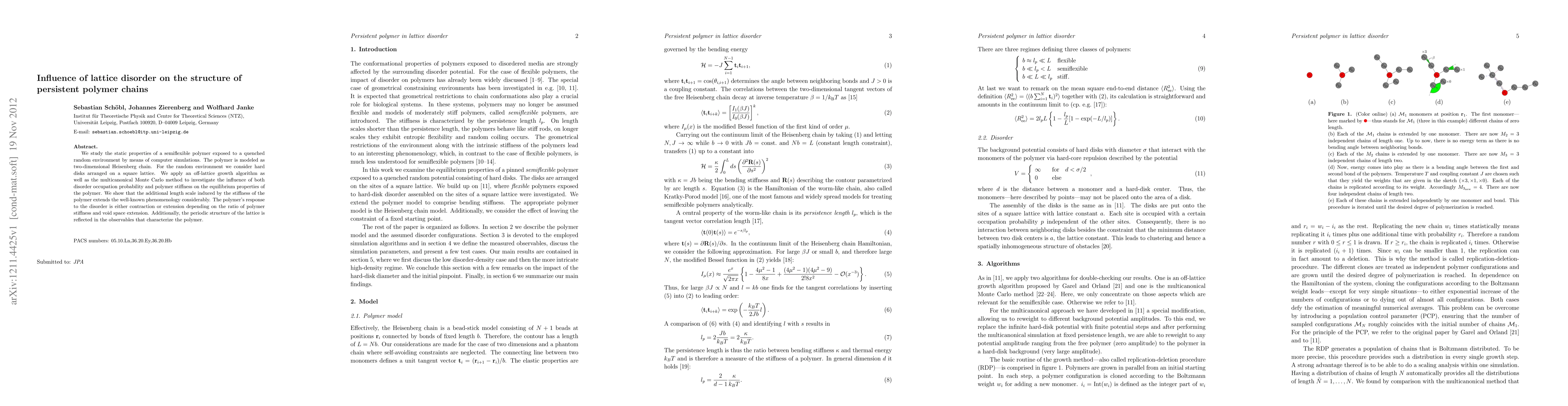 We study the static properties of a semiflexible polymer exposed to a quenched random environment by means of computer simulations. The polymer is modeled as two-dimensional Heisenberg chain. For the random environment we consider hard disks arranged on a square lattice. We apply an off-lattice growth algorithm as well as the multicanonical Monte Carlo method to investigate the influence of both disorder occupation probability and polymer stiffness on the equilibrium properties of the polymer. We show that the additional length scale induced by the stiffness of the polymer extends the well-known phenomenology considerably. The polymer's response to the disorder is either contraction or extension depending on the ratio of polymer stiffness and void space extension. Additionally, the periodic structure of the lattice is reflected in the observables that characterize the polymer.