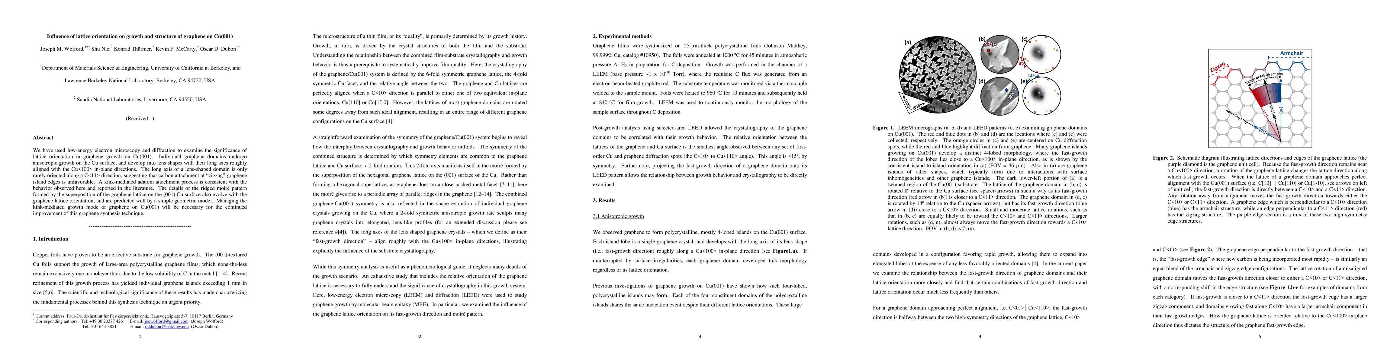 Graphene growth on Cu(001) exhibits anisotropic growth with lens shapes aligned along specific in-plane directions, suggesting a kink-mediated adatom attachment process; this technique's improvement requires managing the growth mode.