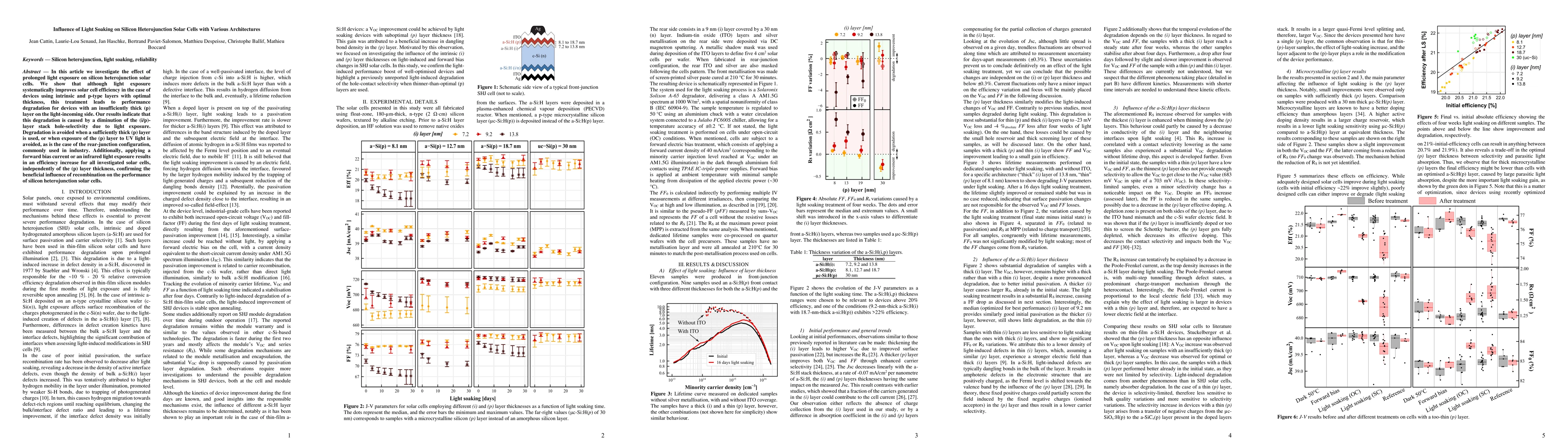 In this article, we investigate the effect of prolonged light exposure on silicon heterojunction solar cells. We show that, although light exposure systematicallyimproves solar cell efficiency in the case of devices using intrinsic and p-type layers with optimal thickness, this treatment leads to performance degradation for devices with an insufficiently thick (p) layer on the light-incoming side. Our results indicate that this degradation is caused by a diminution of the (i/p)-layer stack hole-selectivity because of light exposure. Degradation is avoided when a sufficiently thick (p) layer is used, or when exposure of the (p) layer to UV light is avoided, as is the case of the rear-junction configuration, commonly used in the industry. Additionally, applying a forward bias current or an infrared light exposure results in an efficiency increase for all investigated solar cells, independently of the (p)-layer thickness, confirming the beneficial influence of recombination on the performance of silicon heterojunction solar cells.