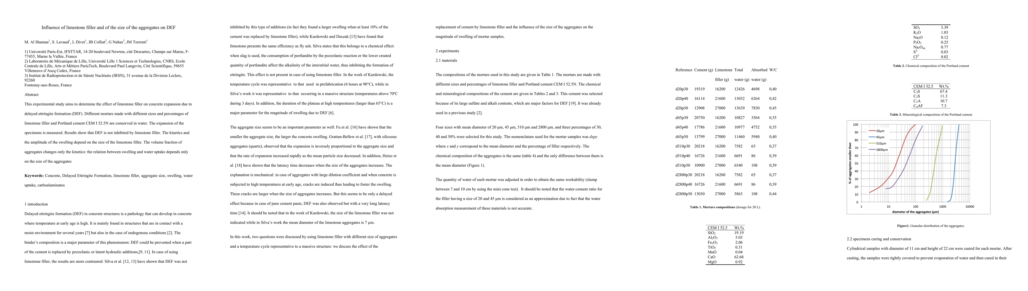 This study investigates the impact of limestone filler and aggregate size on concrete expansion due to delayed ettringite formation (DEF). Results indicate that limestone filler does not inhibit DEF, while aggregate size affects both the kinetics and amplitude of swelling.
