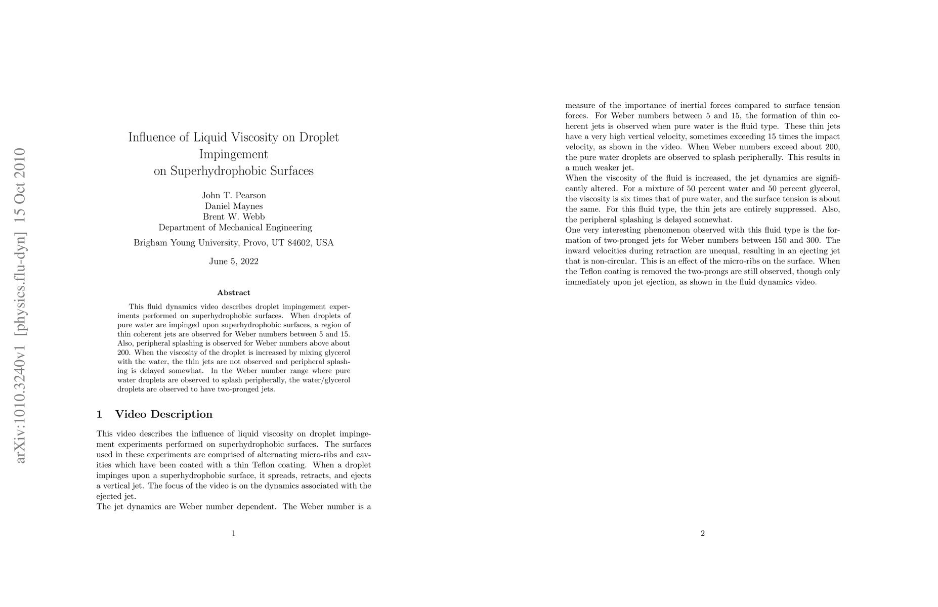 This study examines droplet impingement on superhydrophobic surfaces, finding that increased liquid viscosity delays peripheral splashing and transforms jet formation from thin coherent jets to two-pronged jets.