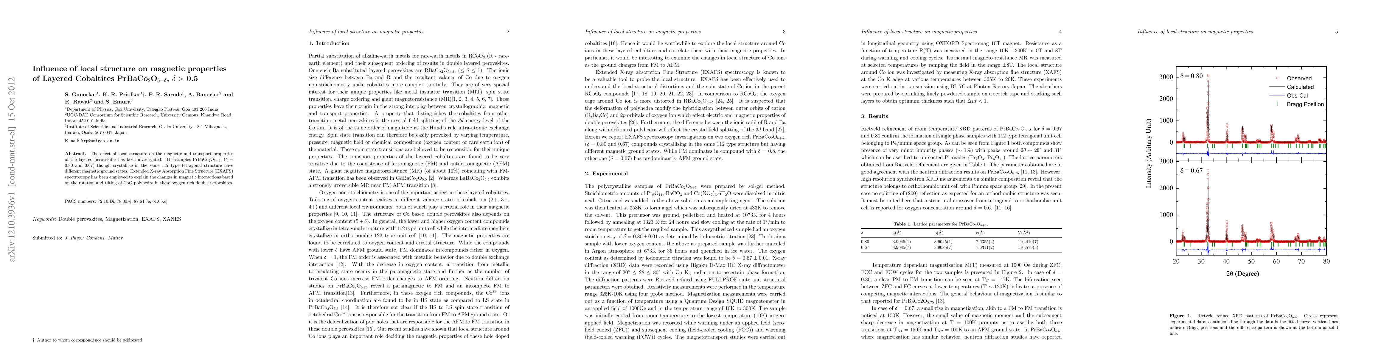 The effect of local structure on the magnetic and transport properties of the layered perovskites has been investigated. The samples PrBaCo$_{2}$O$_{5+\delta}$, ($\delta$ = 0.80 and 0.67) though crystallize in the same 112 type tetragonal structure have different magnetic ground states. Extended X-ray Absorption Fine Structure (EXAFS) spectroscopy has been employed to explain the changes in magnetic interactions based on the rotation and tilting of CoO polyhedra in these oxygen rich double perovskites.
