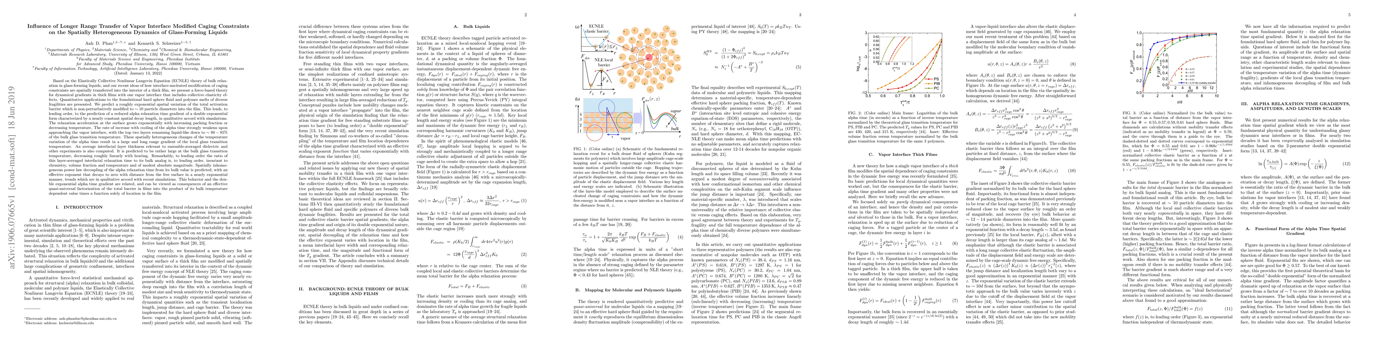 Based on the Elastically Collective Nonlinear Langevin Equation theory of bulk relaxation in glass-forming liquids, and our recent ideas of how interface-nucleated modification of caging constraints are spatially transferred into the interior of a thick film, we present a force-based theory for dynamical gradients in thick films with one vapor interface that includes collective elasticity effects. Quantitative applications to the foundational hard sphere fluid and polymer melts of diverse fragilities are presented. We predict a roughly exponential spatial variation of total activation barrier which is non-perturbatively modified to ~10 particle diameters into film. This leads to prediction of a reduced alpha relaxation time gradient of a double exponential form characterized by a nearly constant spatial decay length, in qualitative accord with simulations. These spatially heterogeneous changes of the temperature variation of the alpha time result in a large and long-range gradient of the local glass transition temperature. An average interfacial layer thickness relevant to ensemble-averaged dielectric and other experiments is also computed. It is predicted to be rather large at the bulk glass transition temperature, decreasing roughly linearly with heating. Spatially inhomogeneous power law decoupling of the alpha relaxation time from its bulk value is predicted, with an effective exponent that decays to zero with distance from the free surface in a nearly exponential manner, trends which are in qualitative accord with recent simulations. This behavior and the double exponential alpha time gradient are related and can be viewed as consequences of an effective quasi-universal factorization of the total barrier in films into the product of its bulk temperature dependent value times a function solely of location in the film.
