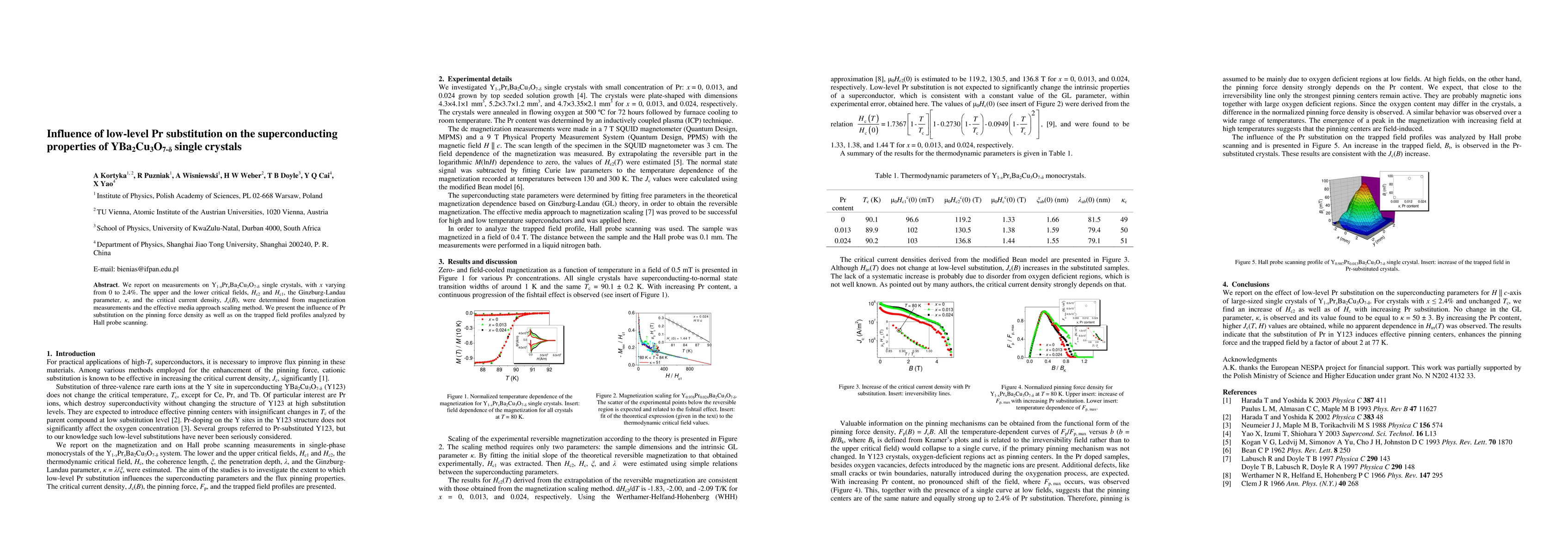 We report on measurements on Y1-xPrxBa2Cu3O7-delta single crystals, with x varying from 0 to 2.4%. The upper and the lower critical fields, Hc2 and Hc1, the Ginzburg-Landau parameter and the critical current density, Jc(B), were determined from magnetization measurements and the effective media approach scaling method. We present the influence of Pr substitution on the pinning force density as well as on the trapped field profiles analyzed by Hall probe scanning.