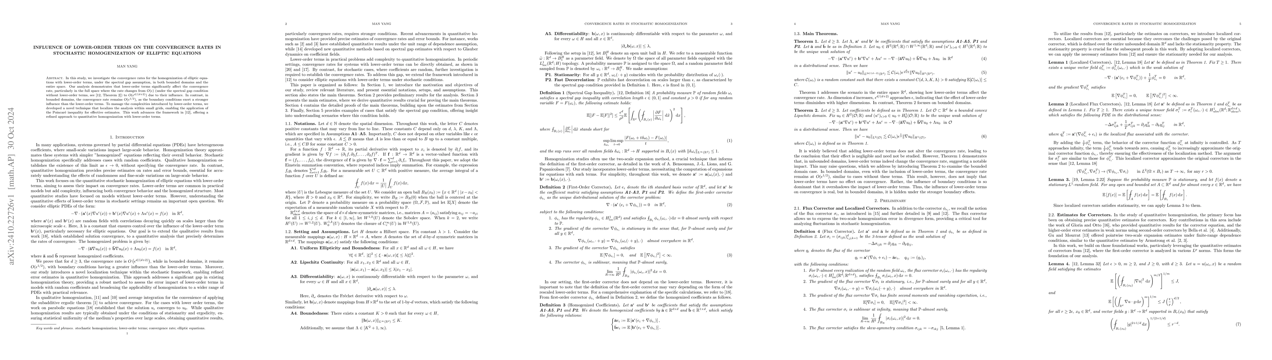 This study examines how lower-order terms impact the convergence rates in stochastic homogenization of elliptic equations. In unbounded spaces, the convergence rate shifts from \(O(\epsilon)\) to \(O(\epsilon^{d/(d+2)})\), while in bounded domains, it remains \(O(\epsilon^{1/2})\) due to stronger boundary influences. A new localization technique is proposed to manage complexities introduced by lower-order terms.