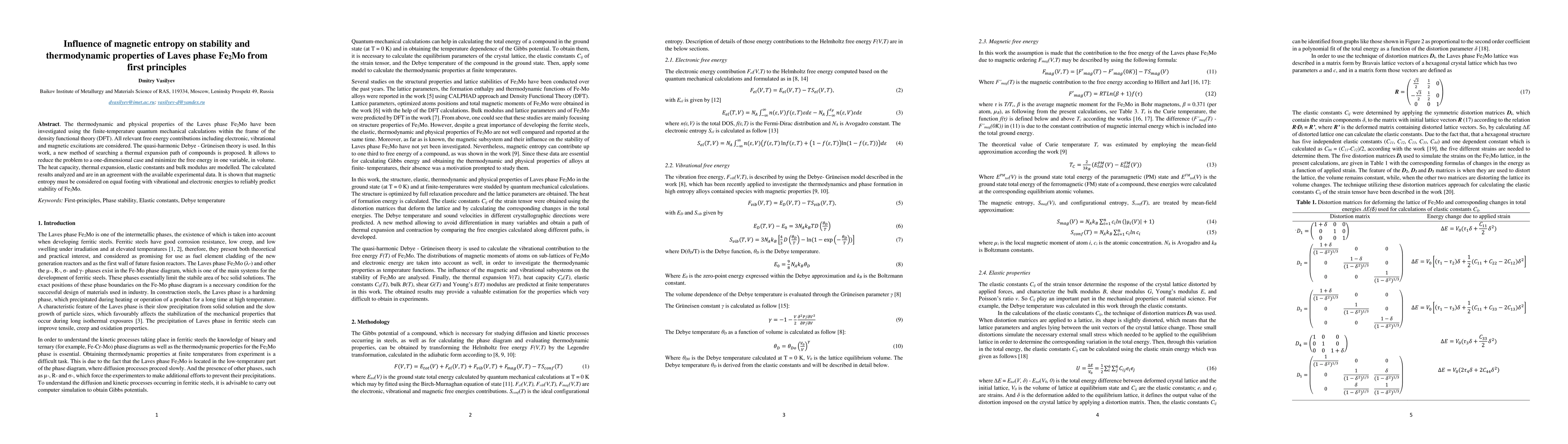 This study investigates the thermodynamic properties of the Laves phase Fe2Mo using density functional theory at finite temperatures, emphasizing the importance of magnetic entropy alongside vibrational and electronic energies for predicting the compound's stability. The proposed method for thermal expansion path search simplifies the analysis and aligns calculated results with experimental data.