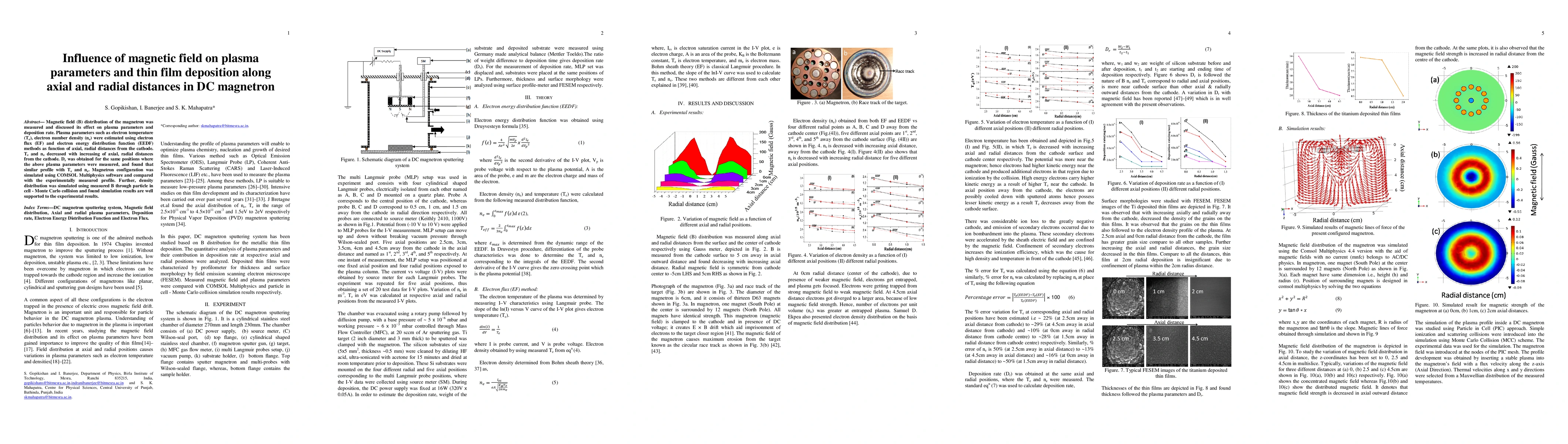 Magnetic field (B) distribution of the magnetron was measured and discussed its effect on plasma parameters and deposition rate. Plasma parameters such as electron temperature (Te), electron number density (ne) were estimated using electron flux (EF) and electron energy distribution function (EEDF) methods as function of axial, radial distances from the cathode. Te and ne decreased with increasing of axial, radial distances from the cathode. Dr was obtained for the same positions where the above plasma parameters were measured, and found that similar profile with Te and ne. Magnetron configuration was simulated using COMSOL Multiphysics software and compared with the experimentally measured profile. Further, density distribution was simulated using measured B through particle in cell - Monte Carlo collision and found simulation results are well supported to the experimental results.