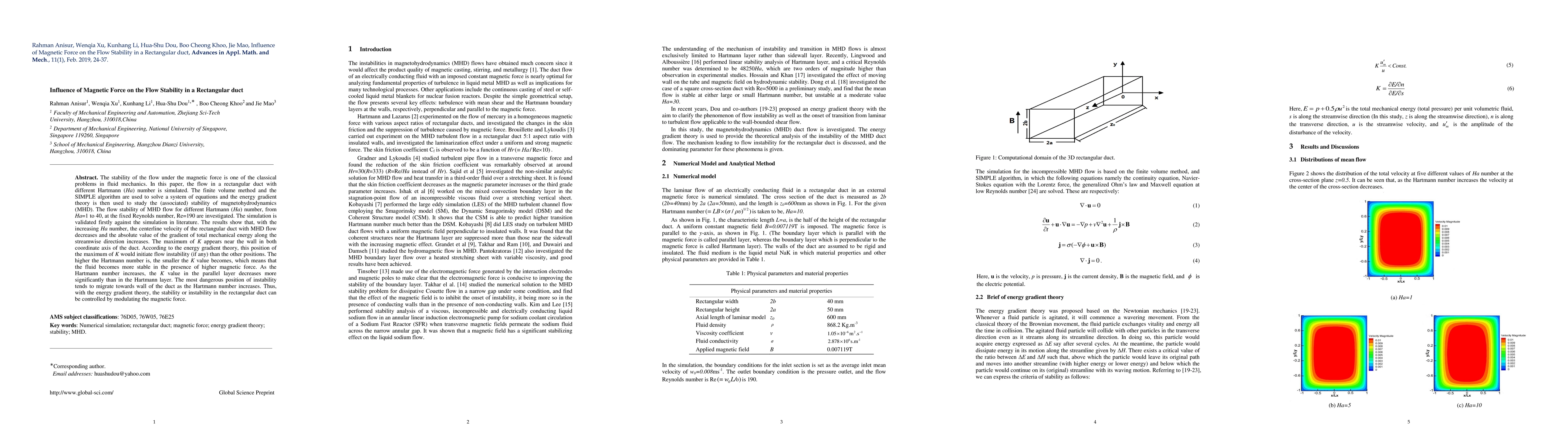 This paper investigates the stability of magnetohydrodynamic (MHD) flow in a rectangular duct under varying Hartmann numbers, using the finite volume method and energy gradient theory. Results show that higher Hartmann numbers lead to decreased centerline velocity and increased mechanical energy gradient, indicating enhanced flow stability with stronger magnetic forces.