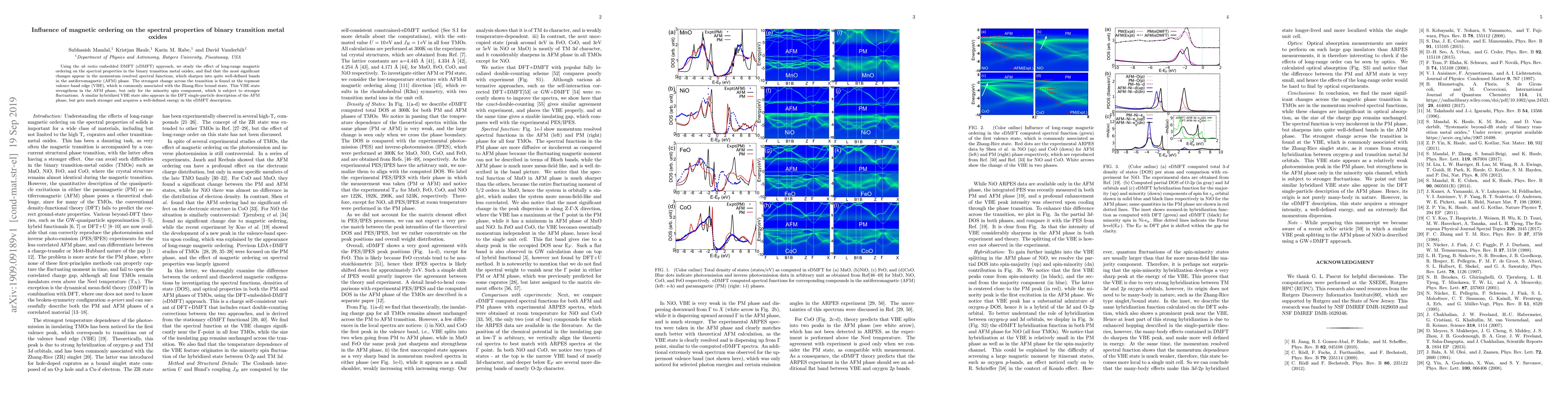 This research employs ab initio embedded DMFT to investigate how magnetic ordering affects spectral properties in binary transition metal oxides, revealing significant sharpening and well-defined bands in momentum-resolved spectral functions during the antiferromagnetic phase, particularly strengthening at the valence band edge for the minority spin component.