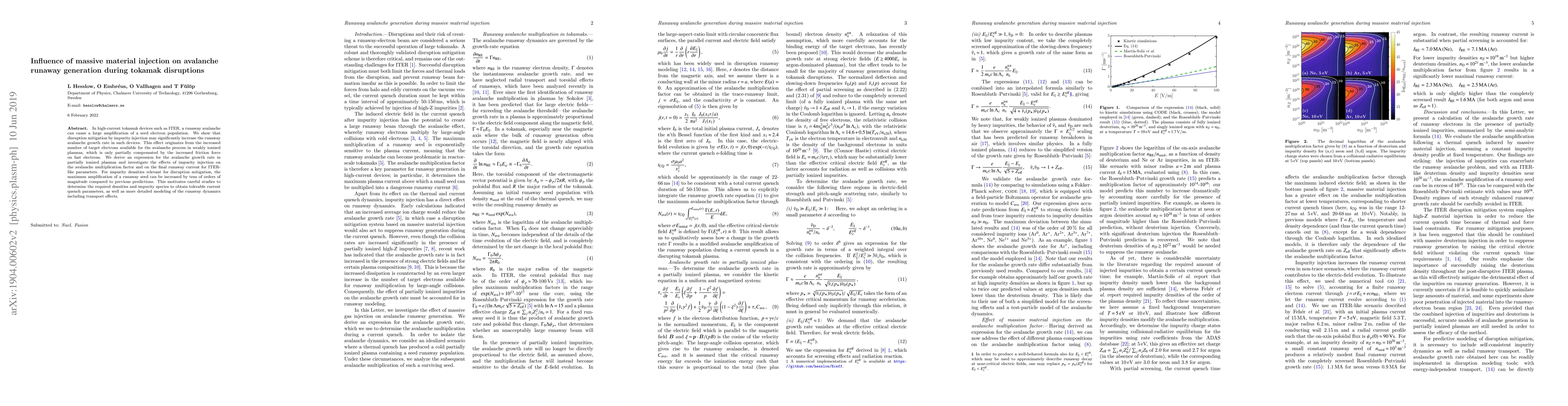 This study investigates how massive material injection during tokamak disruptions can significantly increase the runaway avalanche growth rate by providing more target electrons, despite increased friction. The research highlights the need for careful determination of impurity density and species to manage current quench parameters effectively.