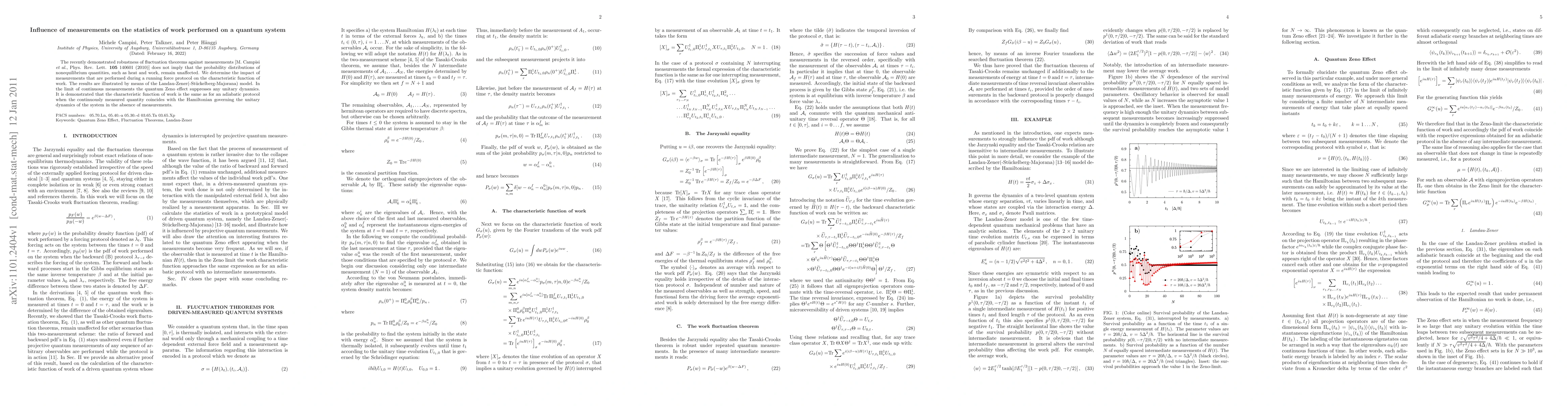 The recently demonstrated robustness of fluctuation theorems against measurements [M. Campisi \emph{et al.}, Phys. Rev. Lett. \textbf{105} 140601 (2010)] does not imply that the probability distributions of nonequilibrium quantities, such as heat and work, remain unaffected. We determine the impact of measurements that are performed during a running force protocol on the characteristic function of work. The results are illustrated by means of the Landau-Zener(-St\"uckelberg-Majorana) model. In the limit of continuous measurements the quantum Zeno effect suppresses any unitary dynamics. It is demonstrated that the characteristic function of work is the same as for an adiabatic protocol when the continuously measured quantity coincides with the Hamiltonian governing the unitary dynamics of the system in the absence of measurements.