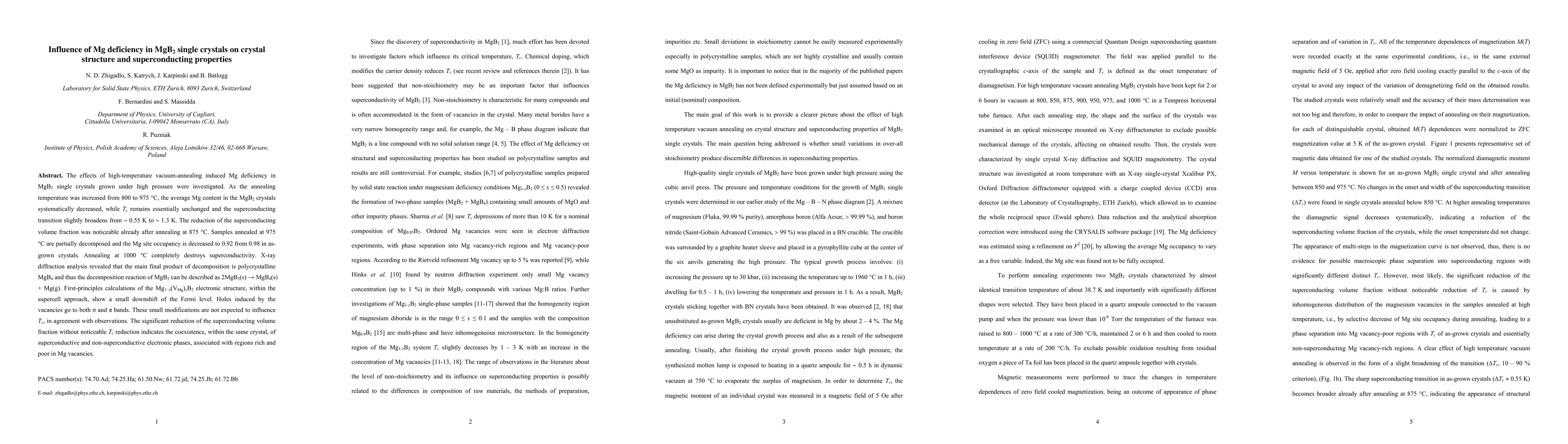 The effects of high-temperature vacuum-annealing induced Mg deficiency in MgB2 single crystals grown under high pressure were investigated. As the annealing temperature was increased from 800 to 975 C, the average Mg content in the MgB2 crystals systematically decreased, while Tc remains essentially unchanged and the superconducting transition slightly broadens from 0.55 K to 1.3 K. The reduction of the superconducting volume fraction was noticeable already after annealing at 875 C. Samples annealed at 975 C are partially decomposed and the Mg site occupancy is decreased to 0.92 from 0.98 in as-grown crystals. Annealing at 1000 C completely destroys superconductivity. X-ray diffraction analysis revealed that the main final product of decomposition is polycrystalline MgB4 and thus the decomposition reaction of MgB2 can be described as 2MgB2(s) = MgB4(s) + Mg(g). First-principles calculations of the Mg1-x(VMg)xB2 electronic structure, within the supercell approach, show a small downshift of the Fermi level. Holes induced by the vacancies go to both sigma and pi bands. These small modifications are not expected to influence Tc, in agreement with observations. The significant reduction of the superconducting volume fraction without noticeable Tc reduction indicates the coexistence, within the same crystal, of superconductive and non-superconductive electronic phases, associated with regions rich and poor in Mg vacancies.