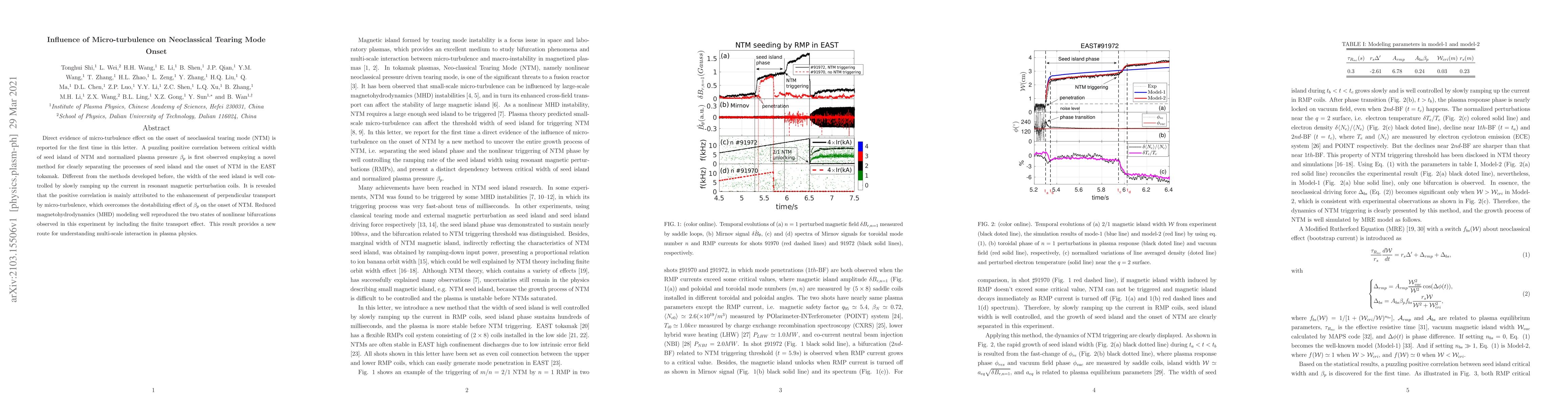 This paper reports the first direct evidence of micro-turbulence's effect on the onset of neoclassical tearing modes (NTM) in the EAST tokamak. The study reveals a positive correlation between the critical width of the seed island and normalized plasma pressure, attributed to micro-turbulence enhancing perpendicular transport, which counters the destabilizing effect of beta_p.