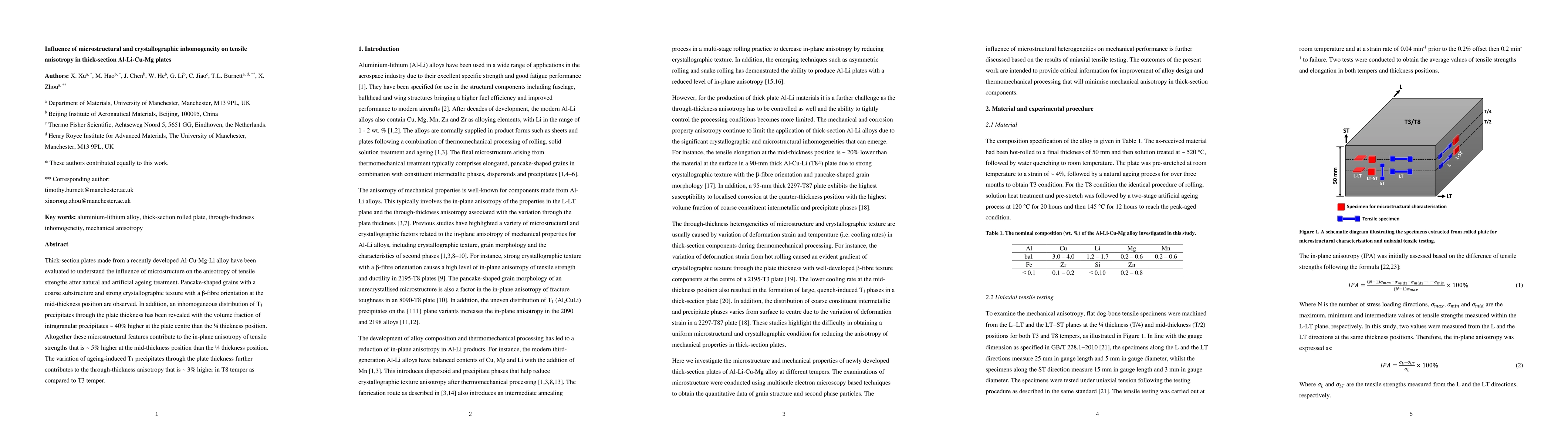 This study investigates the impact of microstructural and crystallographic inhomogeneity on tensile anisotropy in thick-section Al-Li-Cu-Mg alloy plates, revealing that features like grain shape, texture, and precipitate distribution significantly affect anisotropy, with tensile strength ~5% higher at mid-thickness. The inhomogeneous distribution of T1 precipitates also contributes to through-thickness anisotropy, with ~3% higher anisotropy in T8 temper compared to T3 temper.