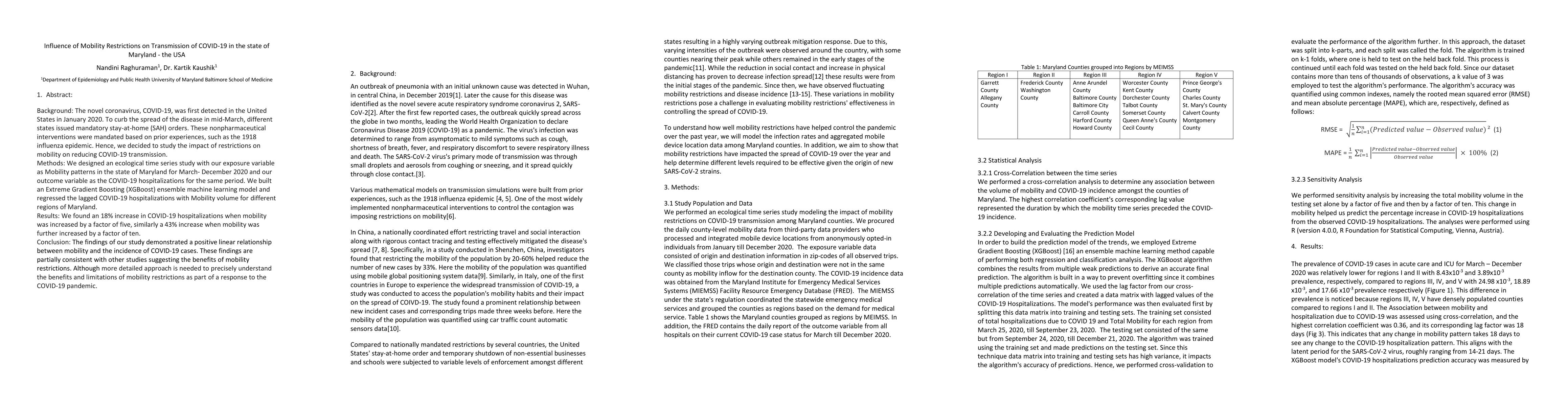 Background: The novel coronavirus, COVID-19, was first detected in the United States in January 2020. To curb the spread of the disease in mid-March, different states issued mandatory stay-at-home (SAH) orders. These nonpharmaceutical interventions were mandated based on prior experiences, such as the 1918 influenza epidemic. Hence, we decided to study the impact of restrictions on mobility on reducing COVID-19 transmission. Methods: We designed an ecological time series study with our exposure variable as Mobility patterns in the state of Maryland for March- December 2020 and our outcome variable as the COVID-19 hospitalizations for the same period. We built an Extreme Gradient Boosting (XGBoost) ensemble machine learning model and regressed the lagged COVID-19 hospitalizations with Mobility volume for different regions of Maryland. Results: We found an 18% increase in COVID-19 hospitalizations when mobility was increased by a factor of five, similarly a 43% increase when mobility was further increased by a factor of ten. Conclusion: The findings of our study demonstrated a positive linear relationship between mobility and the incidence of COVID-19 cases. These findings are partially consistent with other studies suggesting the benefits of mobility restrictions. Although more detailed approach is needed to precisely understand the benefits and limitations of mobility restrictions as part of a response to the COVID-19 pandemic.