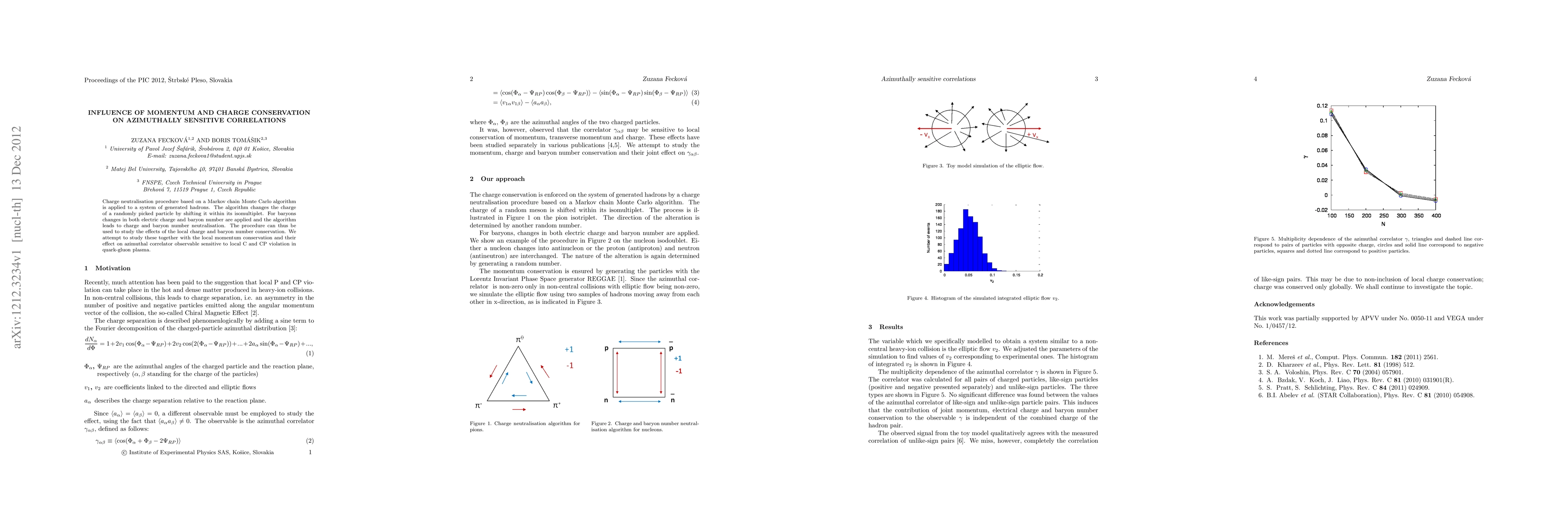 Charge neutralisation procedure based on a Markov chain Monte Carlo algorithm is applied to a system of generated hadrons. The algorithm changes the charge of a randomly picked particle by shifting it within its isomultiplet. For baryons changes in both electric charge and baryon number are applied and the algorithm leads to charge and baryon number neutralisation. The procedure can thus be used to study the effects of the local charge and baryon number conservation. We attempt to study these together with the local momentum conservation and their effect on azimuthal correlator observable sensitive to local C and CP violation in quark-gluon plasma.