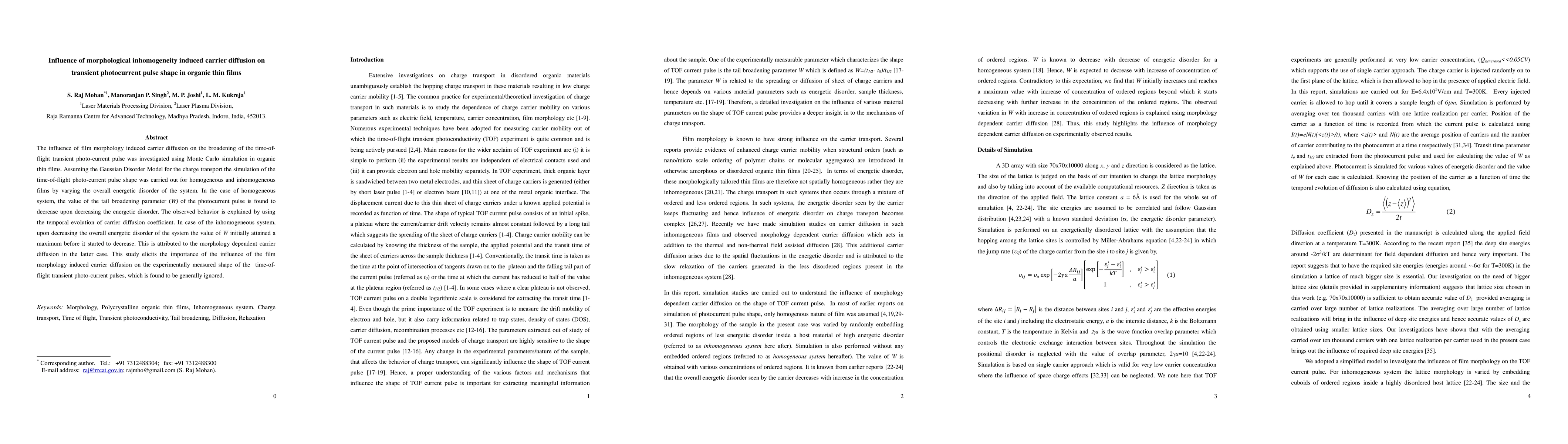 This study investigates how morphological inhomogeneity in organic thin films affects carrier diffusion and the broadening of transient photocurrent pulses using Monte Carlo simulations. The results show that inhomogeneous films exhibit a maximum broadening before decreasing, attributed to morphology-dependent carrier diffusion, highlighting its significance in interpreting experimental photocurrent pulse shapes.