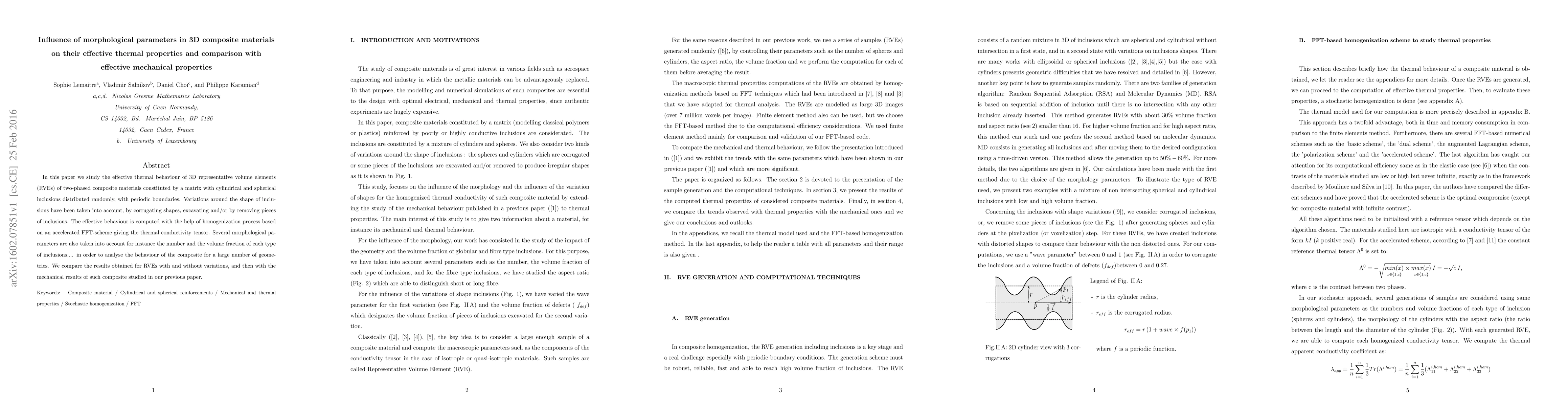 This paper investigates the effective thermal properties of 3D composite materials with varying morphological parameters, including different shapes and distributions of cylindrical and spherical inclusions. It employs an accelerated FFT-based homogenization method to compute thermal conductivity tensors and compares these thermal results with previously obtained mechanical properties.