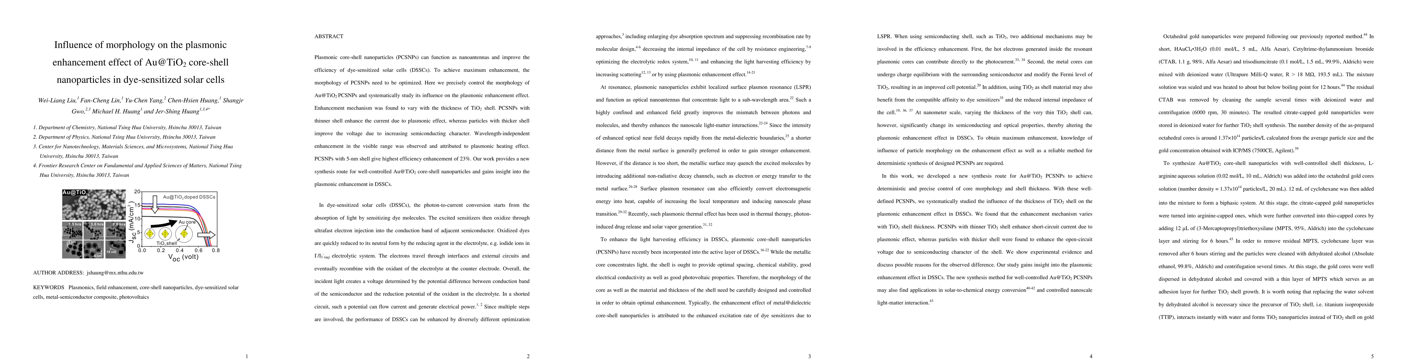 This study investigates how the morphology of Au@TiO2 core-shell nanoparticles influences plasmonic enhancement in dye-sensitized solar cells, finding that thinner TiO2 shells boost current while thicker shells enhance voltage, with 5-nm shell thickness yielding a 23% efficiency increase.